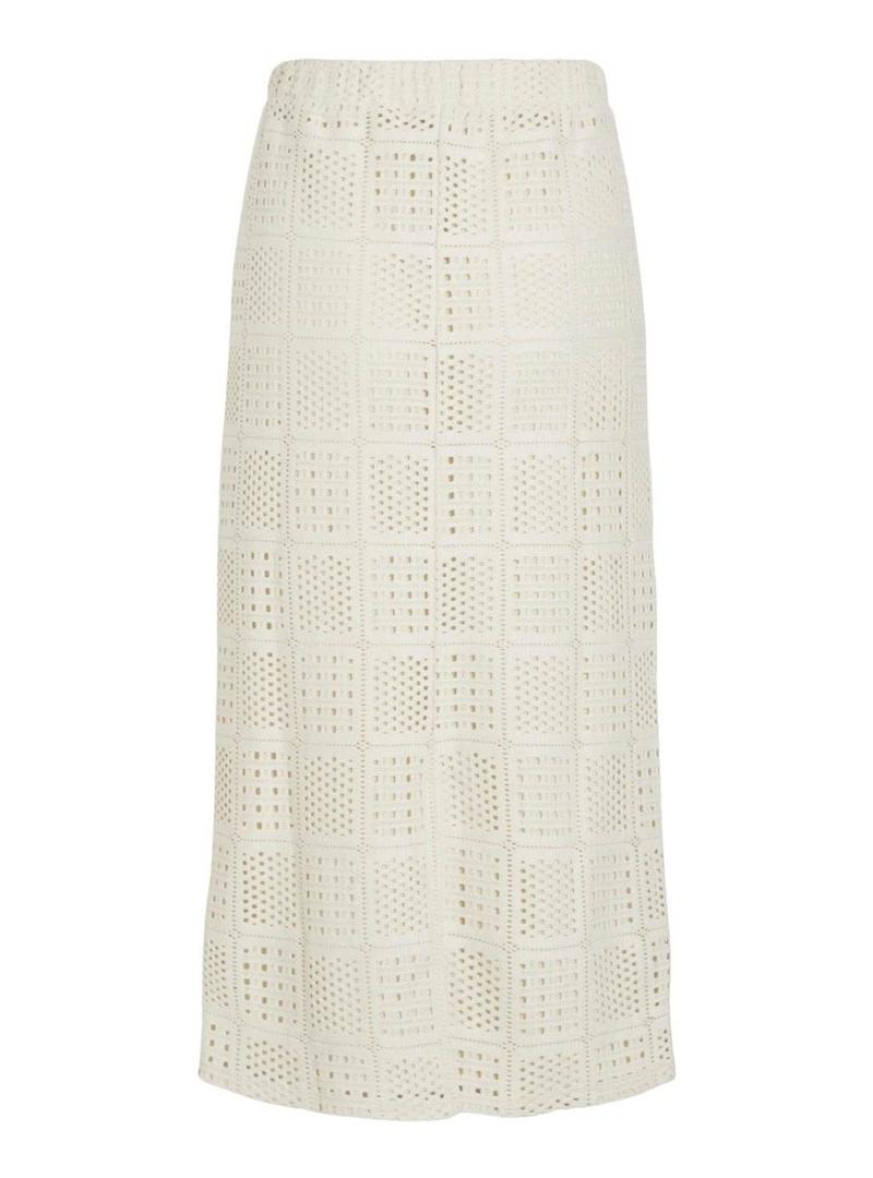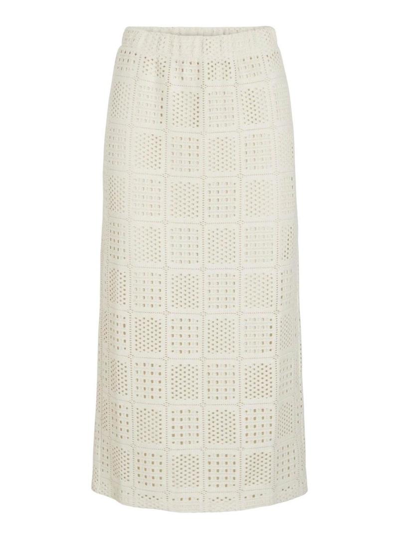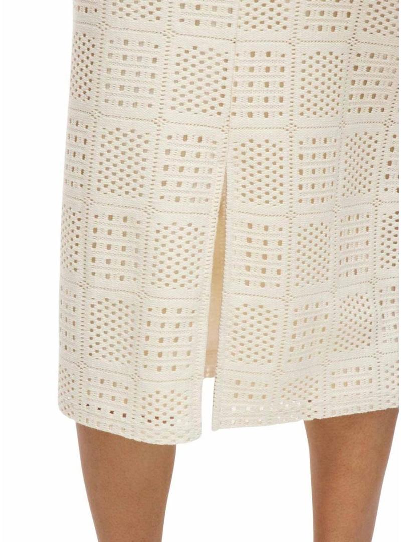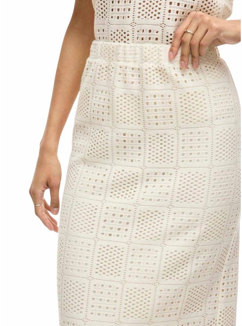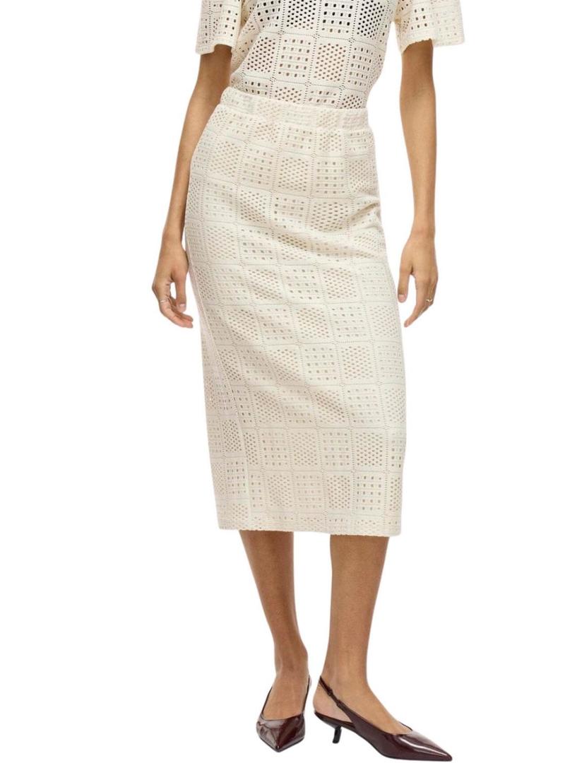 Saia Vila. Cor bege. Tecido perfurado. Comprimento midi. Cintura alta. Forrada. Cintura elástica. Abertura traseira.