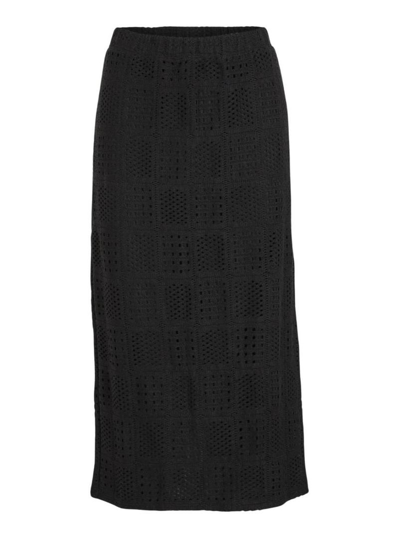 Saia Vila. Cor preta. Tecido perfurado. Comprimento midi. Cintura alta com elástico. Forrado. Abertura traseira. A modelo está vestindo o tamanho S.