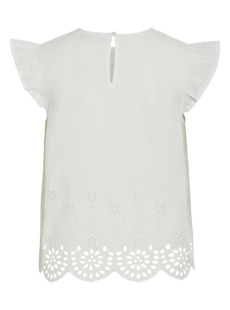 Blusa Vila. Cor branca. Sem mangas. Gola redonda. Fecho traseiro com botão de casa. Ombros com babados. Detalhes bordados. Bainha ondulada. Corte regular. A modelo veste o tamanho 36.