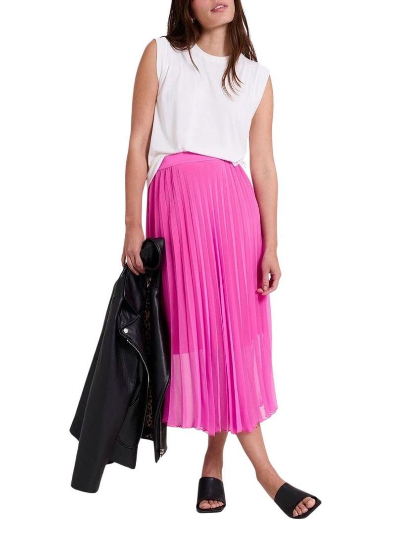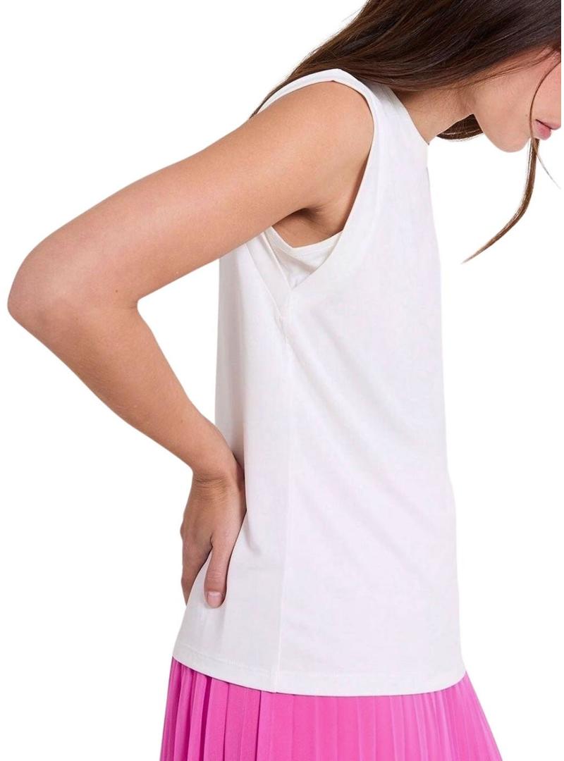 Camiseta Naf Naf. Cor branca. Tecido leve. Sem mangas. Detalhe de lapela no ombro. Gola redonda. A modelo está vestindo o tamanho S.