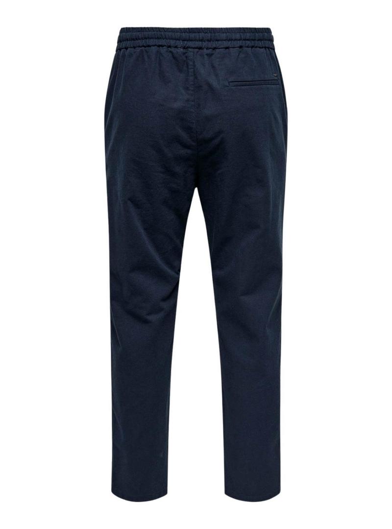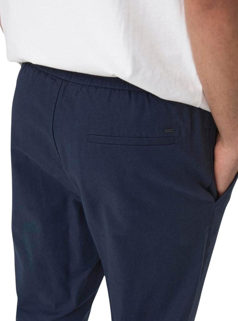 Calça Only and Sons. Modelo Linus. Cor azul marinho. Cintura elástica com cordão. Bolsos laterais. Bolsos traseiros com aba. Corte slim. Barra angustiada. Tecido leve.