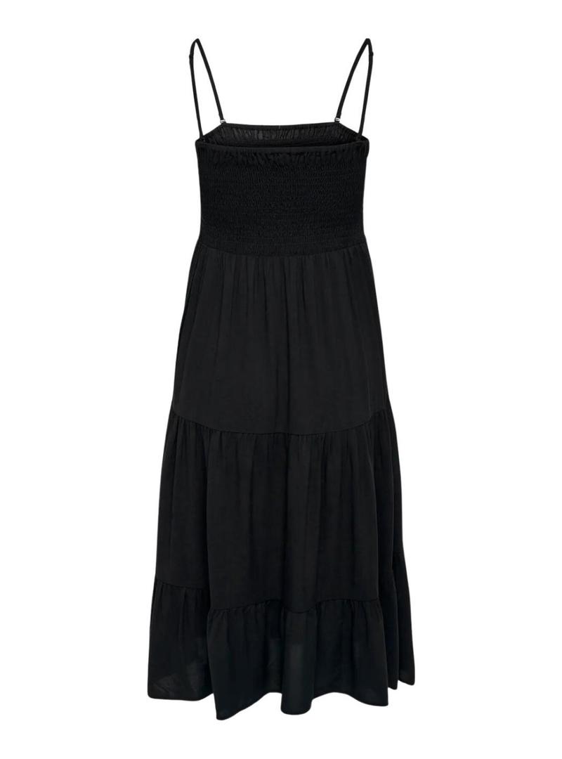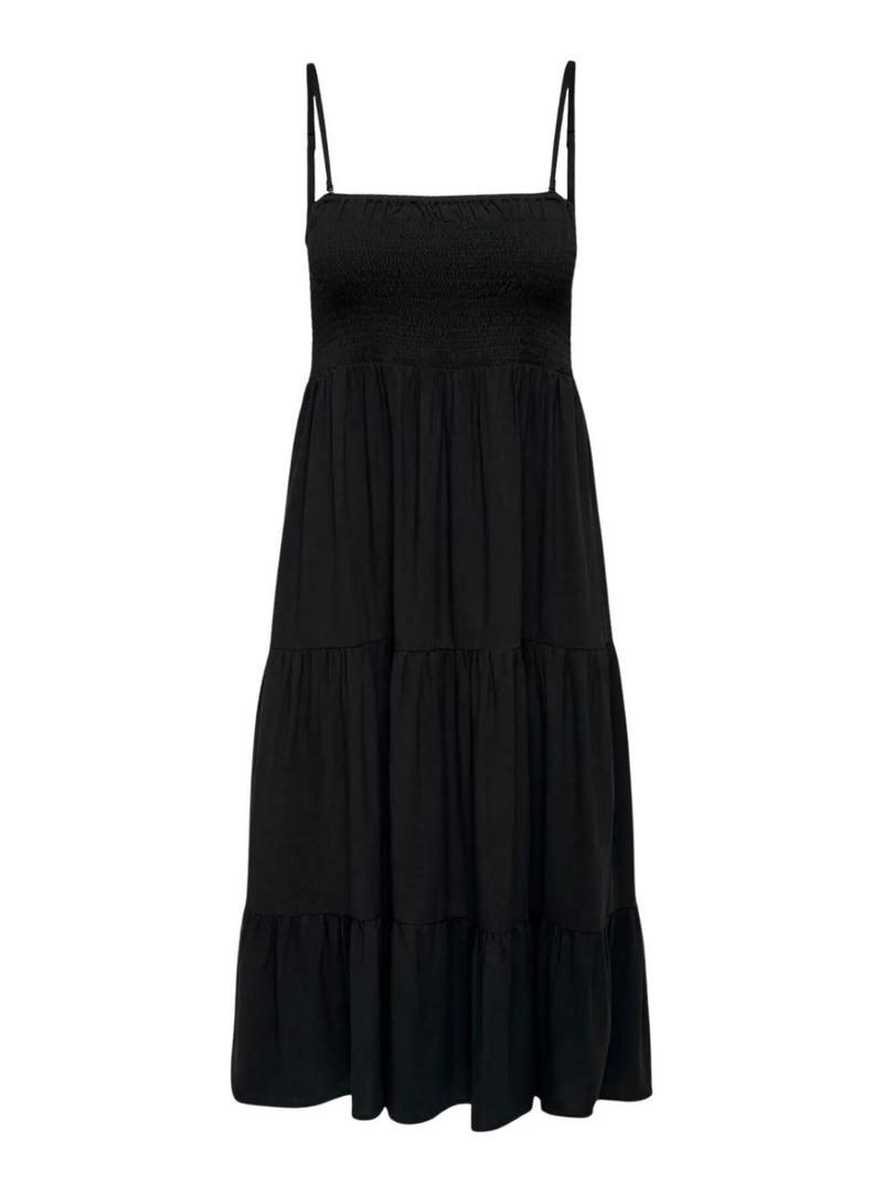 Vestido Only. Modelo Zelina. Cor preta. Alças finas ajustáveis. Ajustado no peito. Comprimento midi. Saia folgada. Alças removíveis. Pode ser convertido em decote tomara que caia.