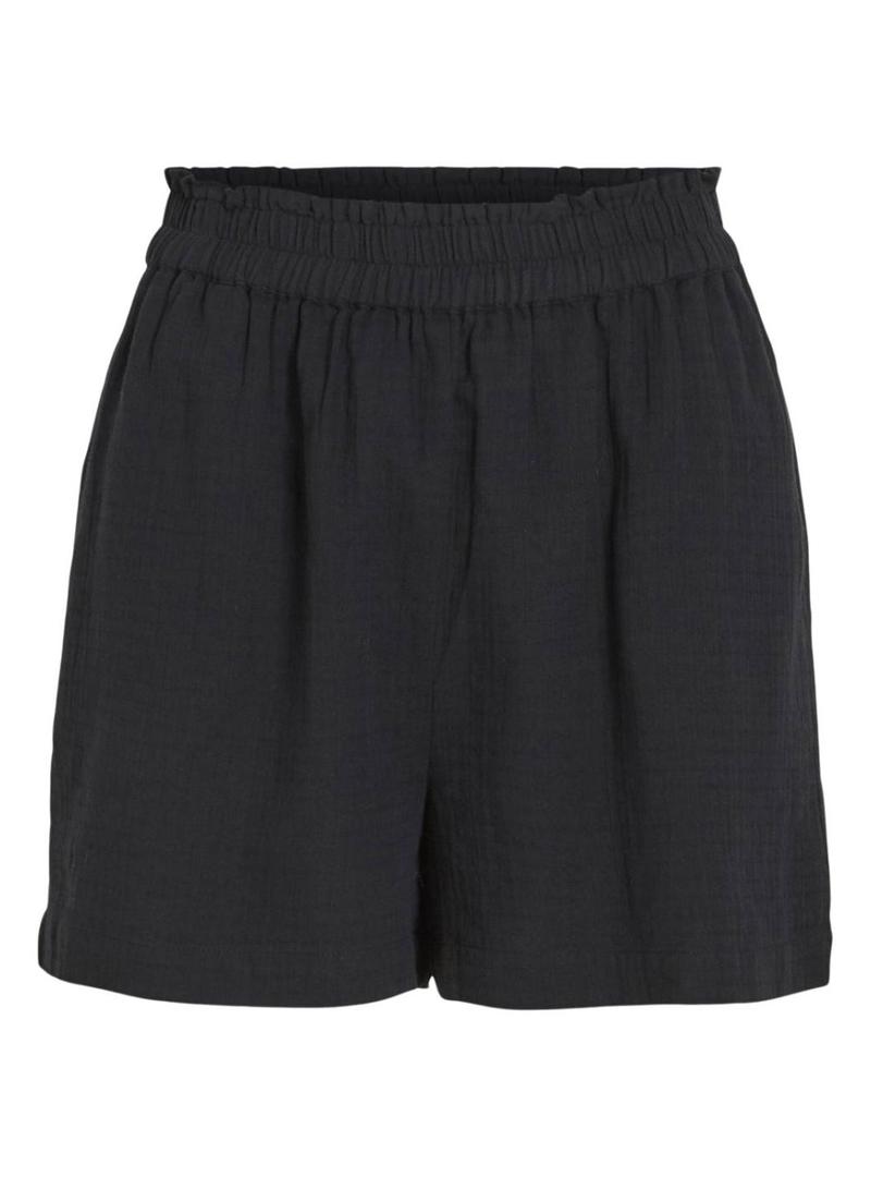 Shorts Vila. Cor preta. Cintura alta de elástico. Bolsos laterais. Corte folgado. Bolsos laterais. O modelo veste o tamanho 36.