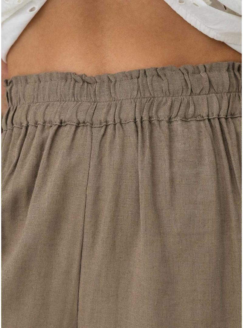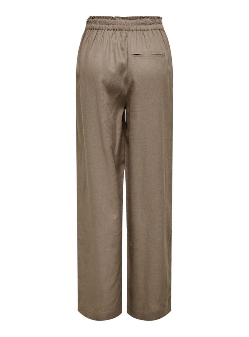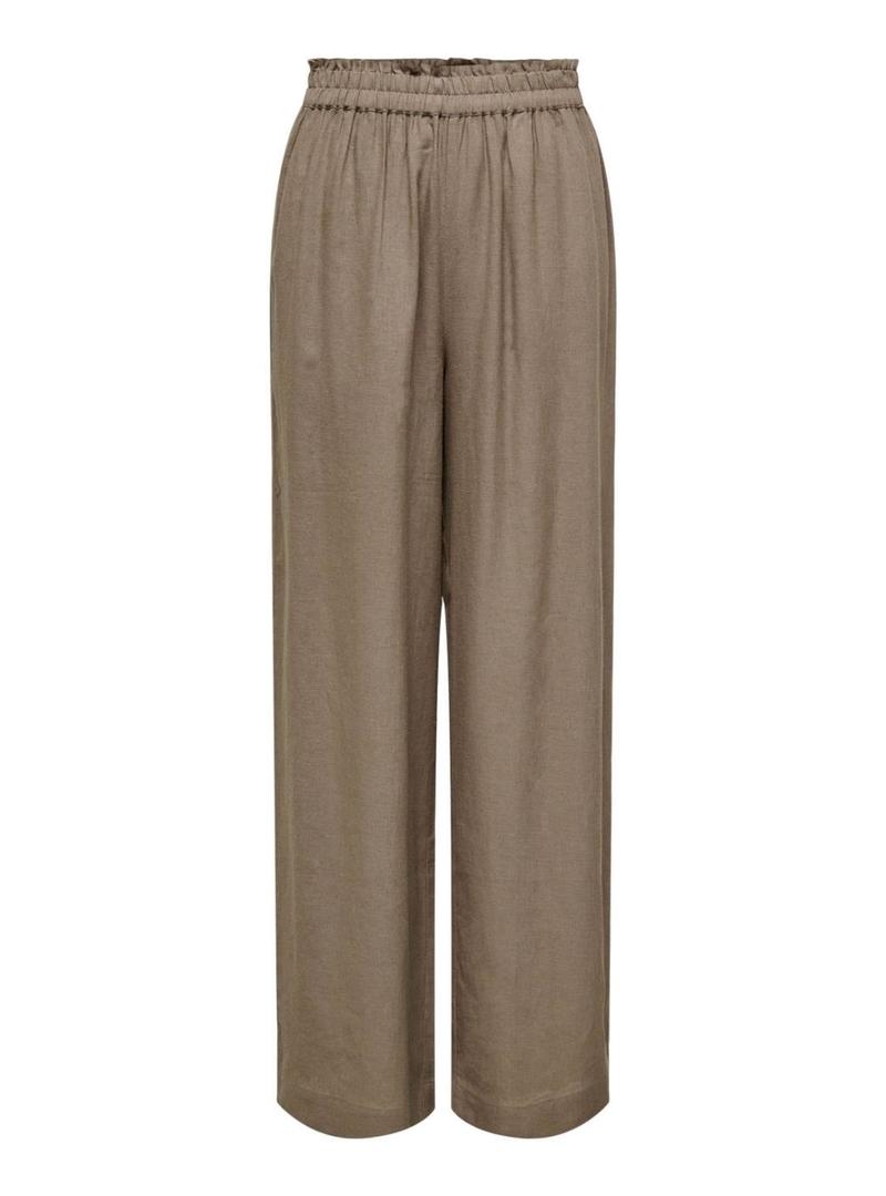 Calças Only. Tecido leve com linho. Cor marrom. Bolsos laterais. Cintura alta com elástico. Corte reto. Um bolso traseiro.