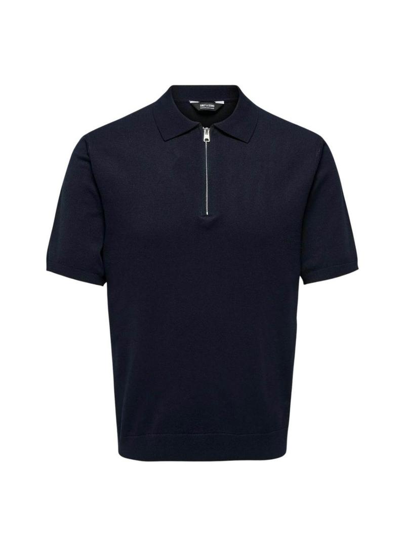 Camisa Polo Only and Sons. Modelo Wyler. Cor azul marinho. Colarinho com zíper. Manga curta. Pontas caneladas. Caimento regular. Etiqueta lateral da marca. Estilo básico. Tecido de malha.