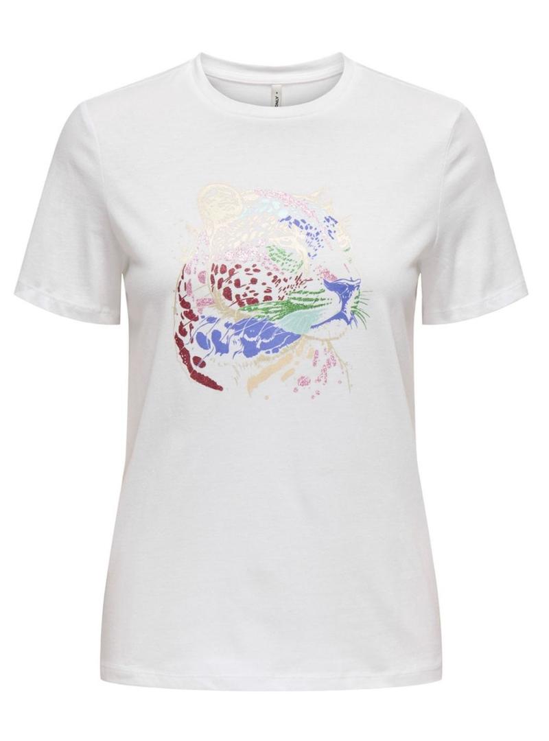 Camiseta Only. Modelo Lucia. Cor branca. Manga curta. Corte regular. Gráfico com glitter colorido estampado no peito. Gola redonda.