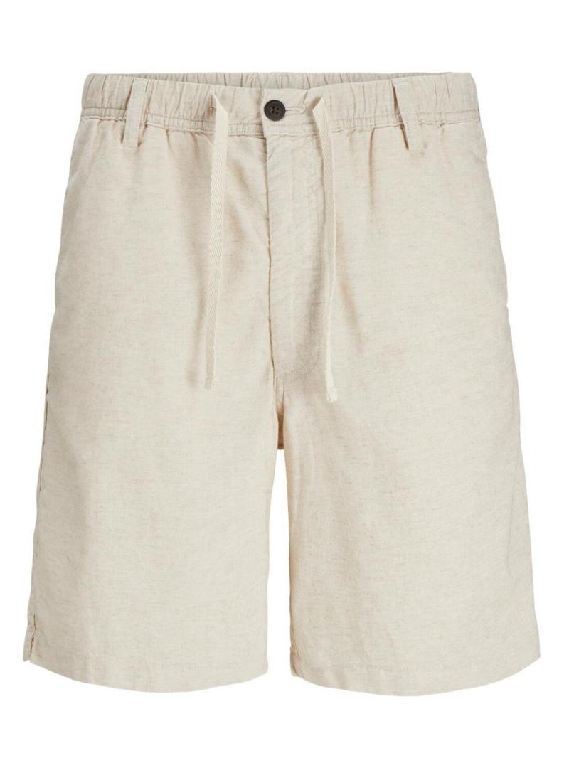 Bermudas Jack and Jones. Modelo Jaiden. Cor bege. Cintura elástica com cordão de ajuste. Quatro bolsos. Logotipo da marca bordado. Comprimento até o meio da coxa. Corte folgado. Tecido em mistura de linho. Fecho frontal com zíper e botão. Passadores na cintura para cinto.