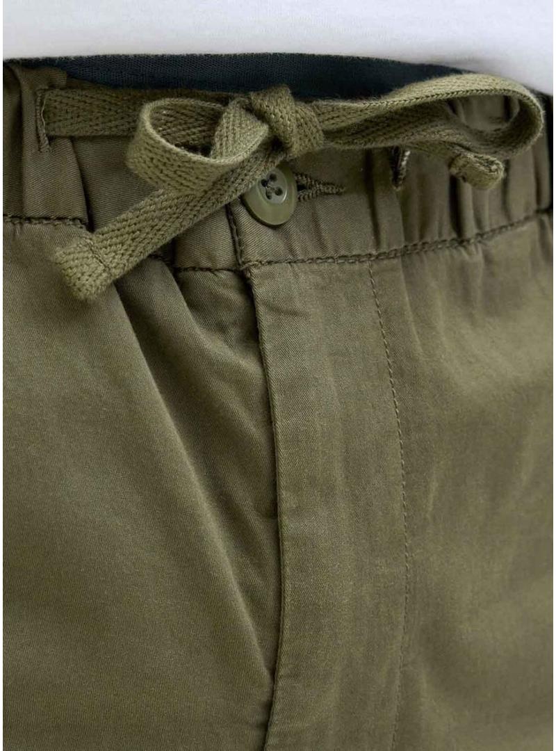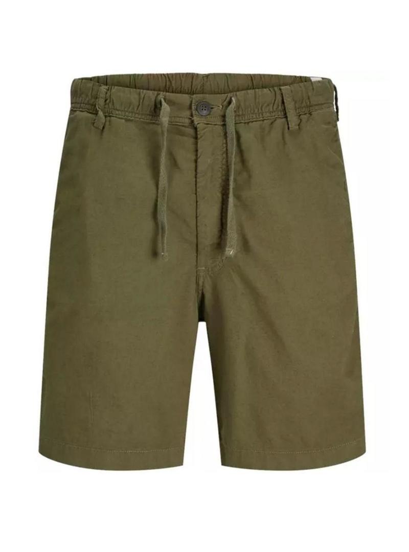 Bermudas Jack and Jones. Modelo Jaiden. Cor verde. Cintura elástica com cordão ajustável. Quatro bolsos. Logotipo da marca bordado. Comprimento acima do joelho. Corte regular. Tecido misto de linho. Fecho frontal com zíper e botão.