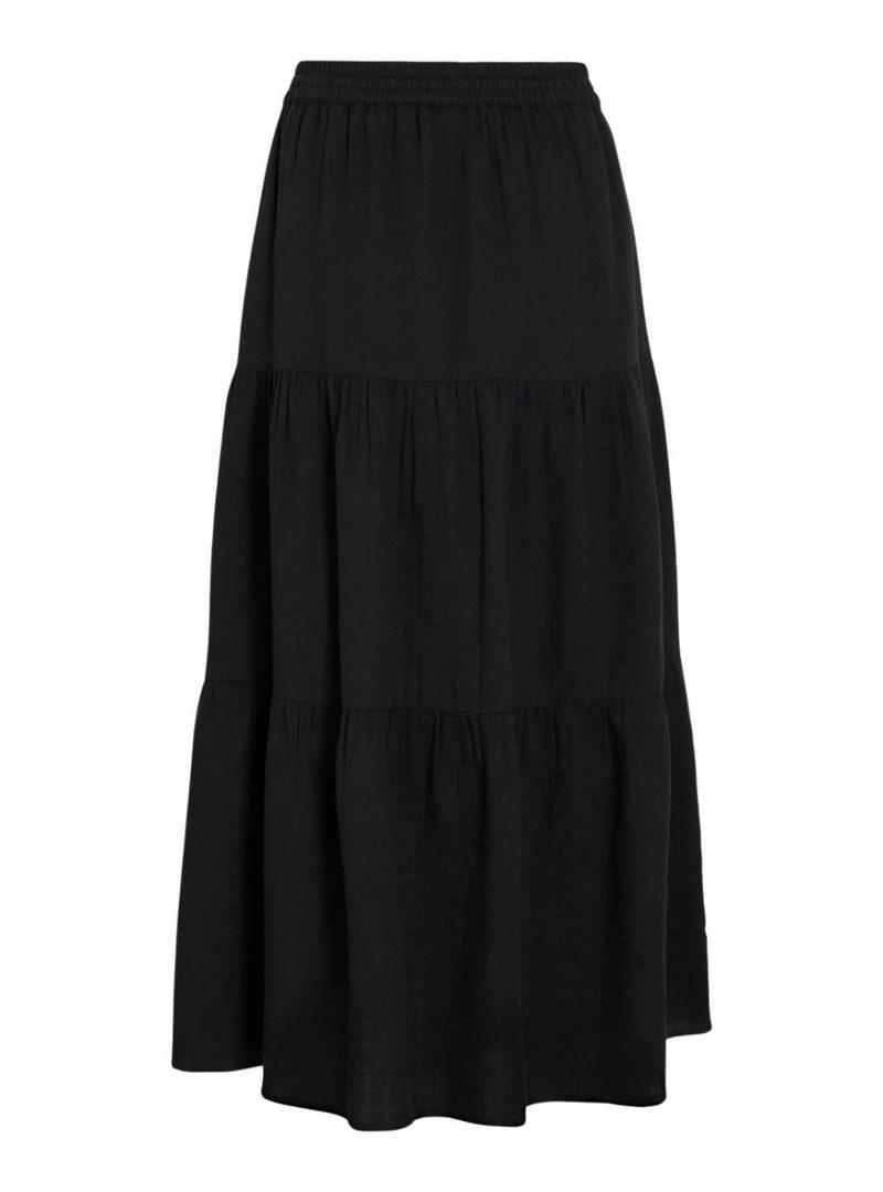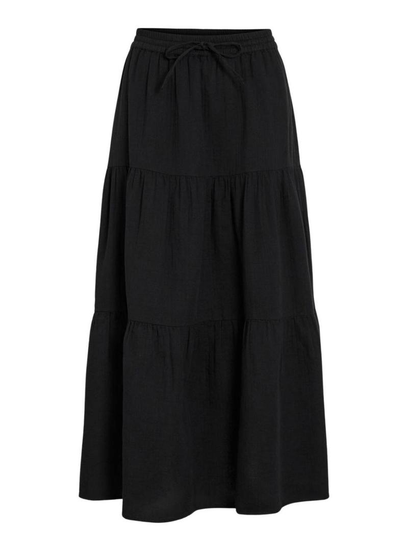 Saia Vila. Modelo Lania. Cor preto. Comprimento midi. Saia com babados. Estilo boho. Cintura ajustável com cordão. Tecido leve.