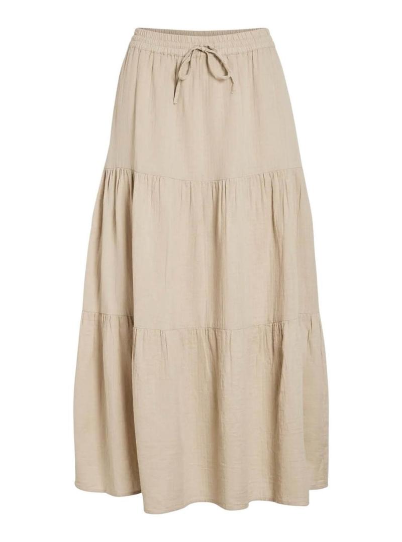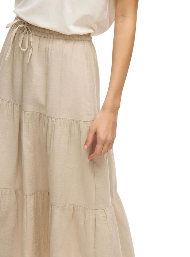 Saia Vila. Modelo Vilania. Cor bege. Corte midi. Saia com babados. Estilo boho. Cintura ajustável com cordão. Tecido leve. Forro interno.