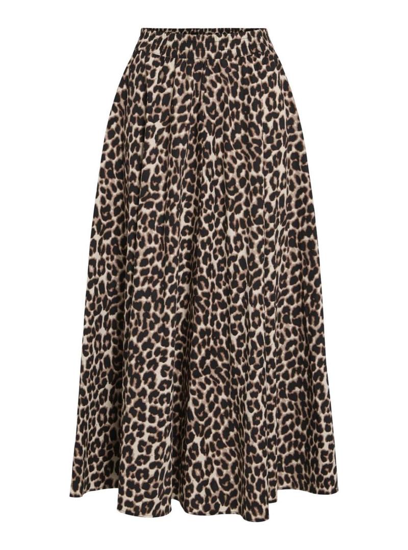 Saia Vila. Modelo Vivalencia. Estampa animal print. Cores terra. Cintura elástica. Comprimento midi. Corte evasê com volume.