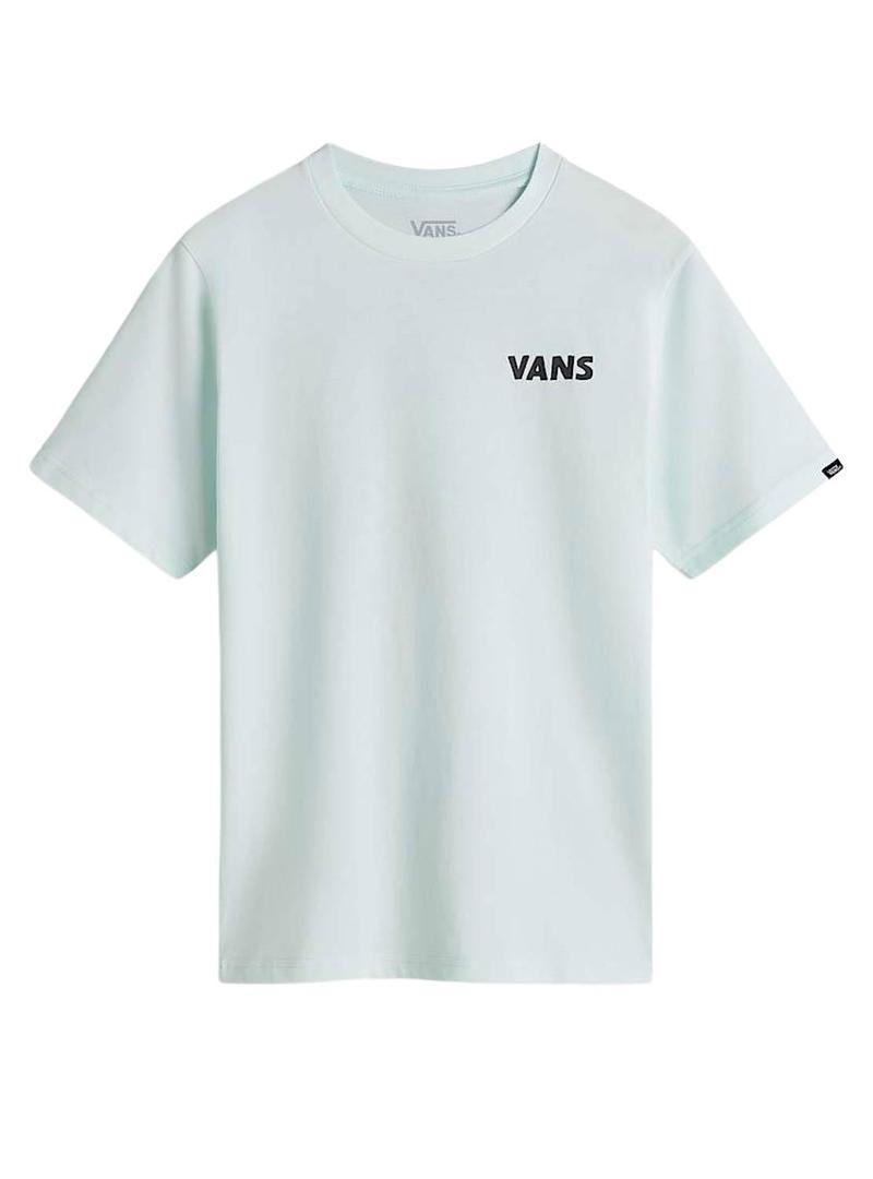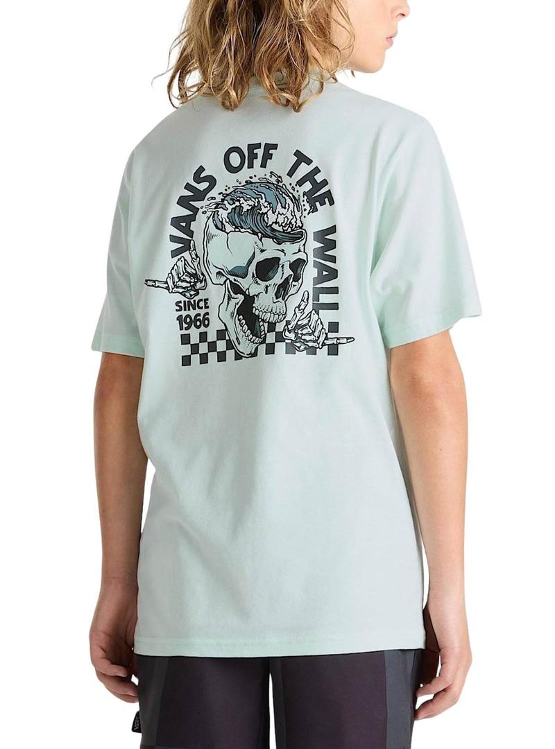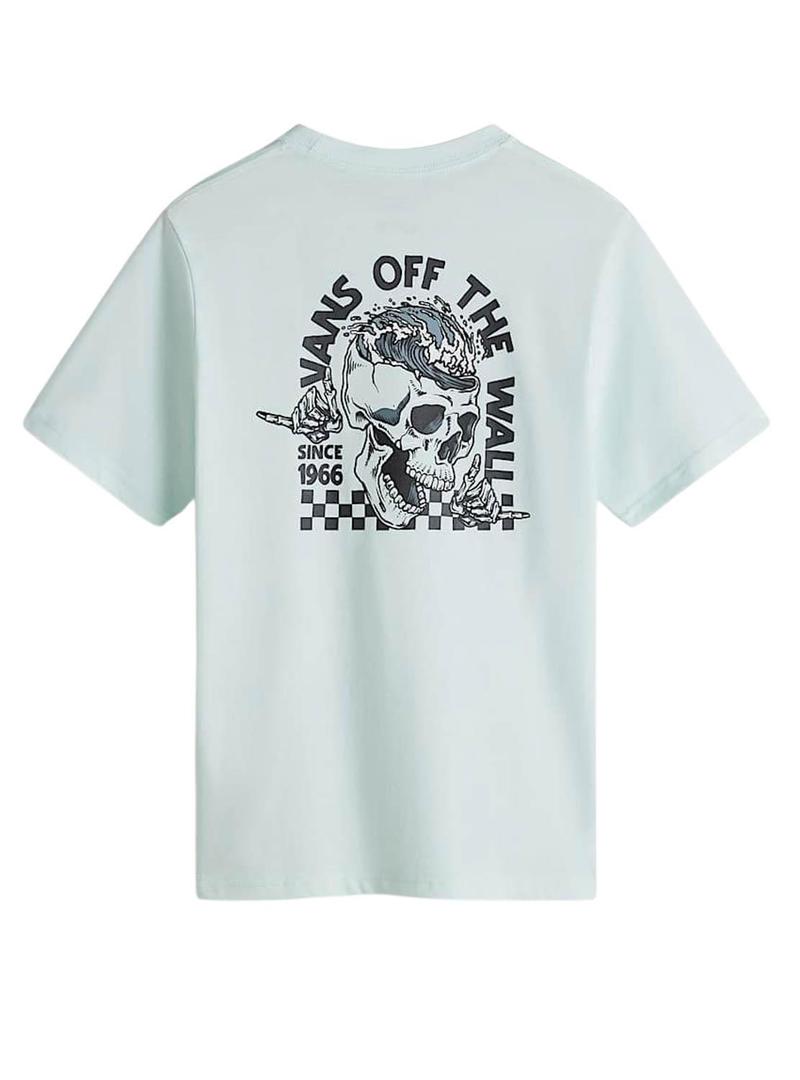 Camiseta Vans. Modelo Headwaves. Cor azul turquesa. Marca estampada no peito. Ilustração estampada nas costas.