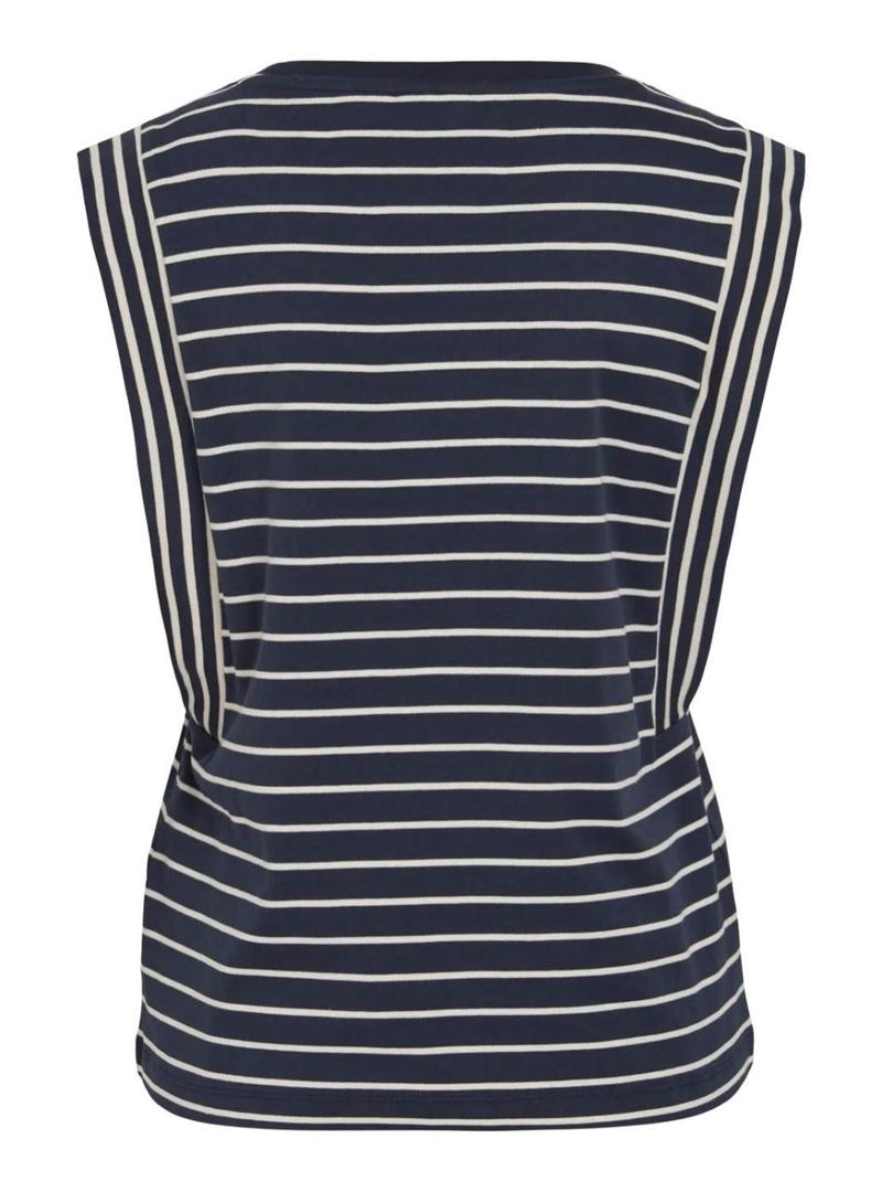 Camiseta Vila. Modelo Viveriana. Cor azul marinho e branco. Gola redonda. Ajuste regular. Sem mangas. Efeito ombreira.