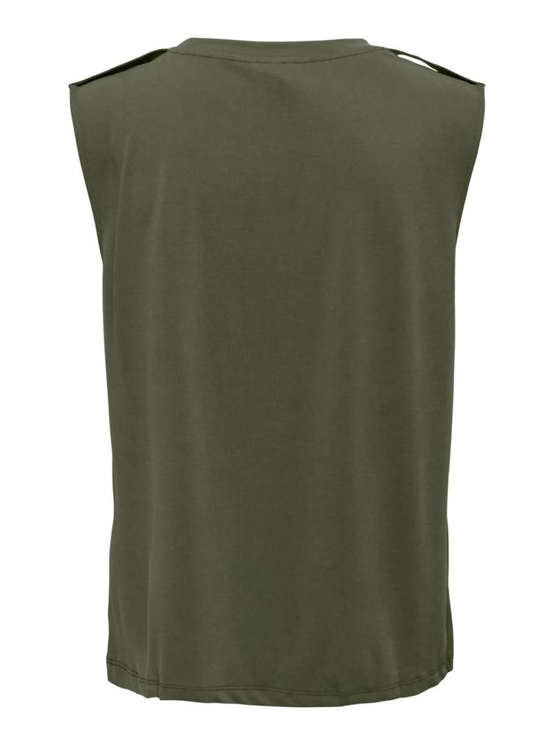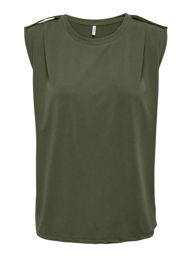Camiseta Only. Modelo Livre. Tecido acetinado. Cor verde. Sem mangas. Presilhas nos ombros. Corte folgado. Gola redonda. Ajuste regular. Detalhe franzido nos ombros.