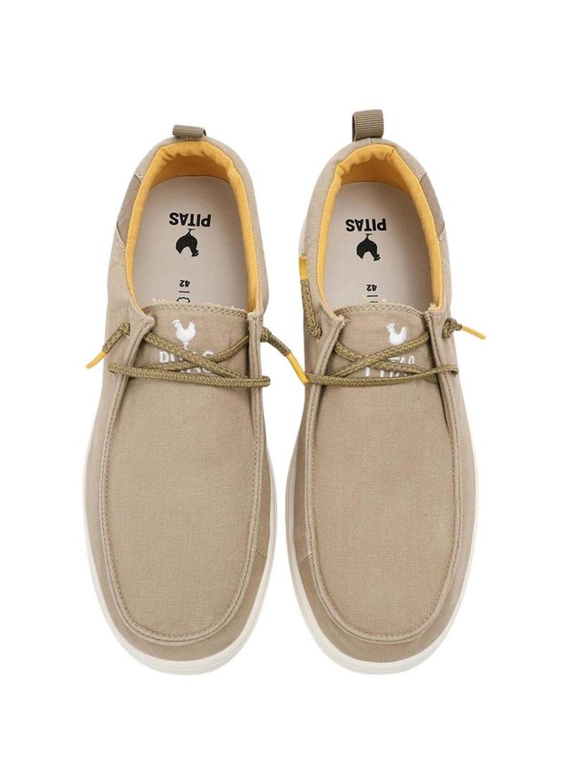 Sapatos Walkin Pitas. Cor bege. Tecido de algodão lavado. Forro de algodão. Sola Coast de EVA flexível e leve. Sola antiderrapante. Palmilha Confort ergonômica forrada em couro. Cadarços elásticos para um ajuste confortável.
