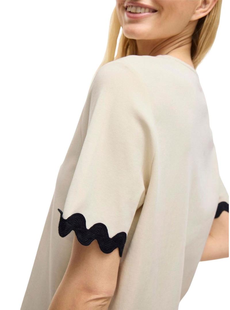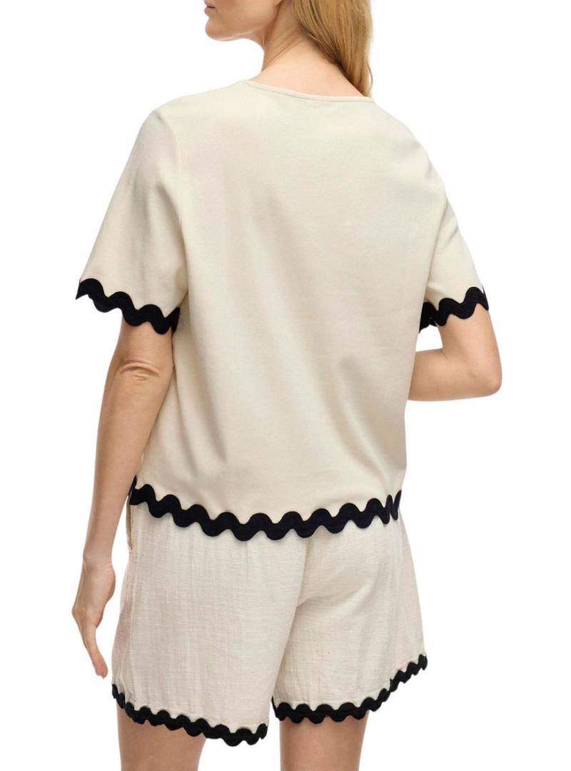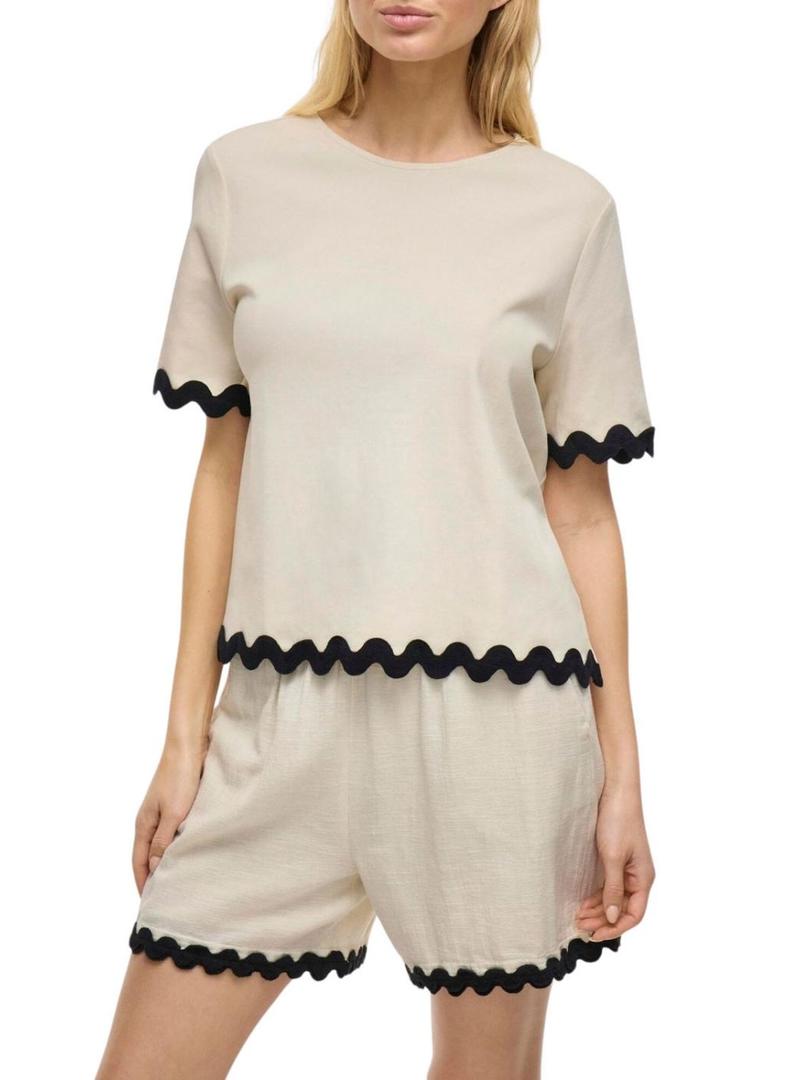 Top Vila. Modelo Calisa. Cor bege. Gola redonda. Manga curta. Acabamentos festonados. Corte regular.
