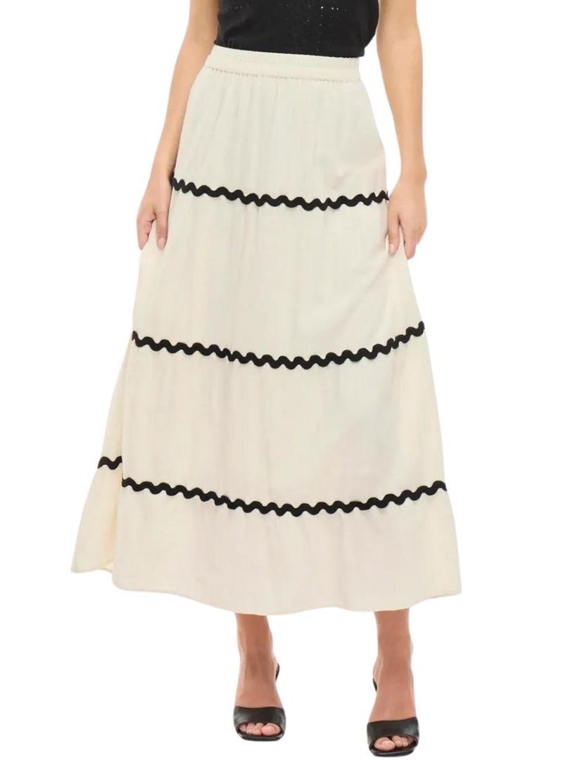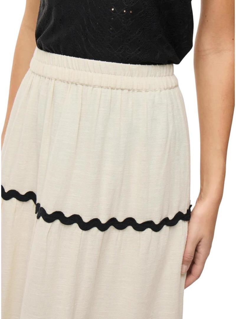 Saia Vila. Modelo Manda. Cor bege. Comprimento maxi. Cintura elástica. Detalhes festonados. Forro interno. Corte regular.