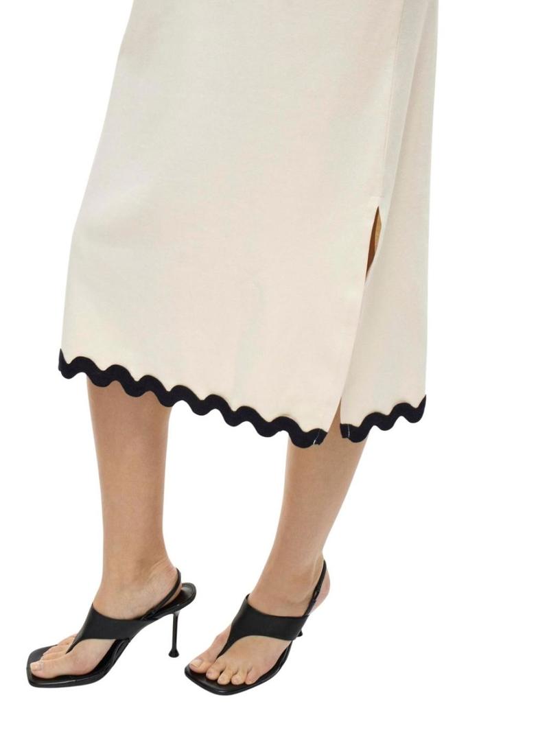 Vestido Vila. Modelo Calisa. Cor bege. Comprimento midi. Detalhes festoneados. Manga curta. Gola redonda. Corte regular.