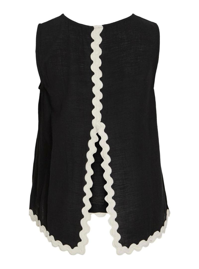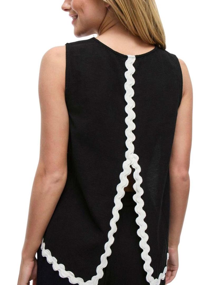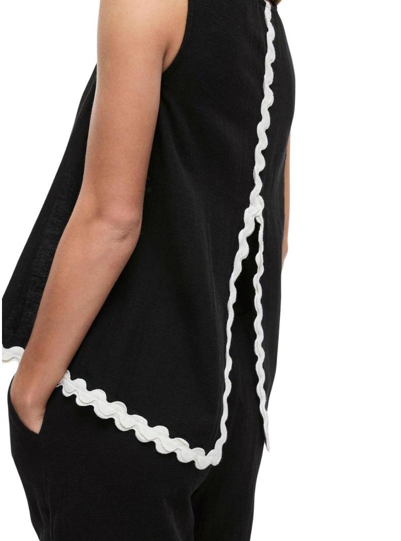 Top Vila. Modelo Manda. Cor preta. Sem mangas. Gola redonda. Abertura nas costas. Bordas festonadas. Corte folgado.