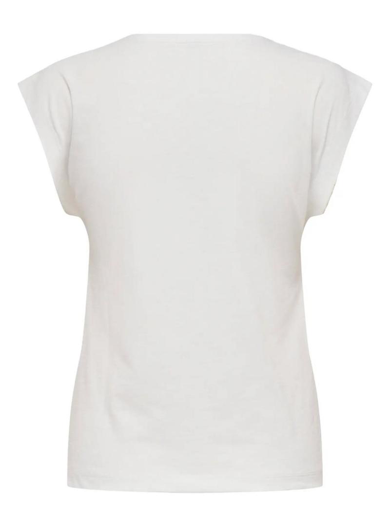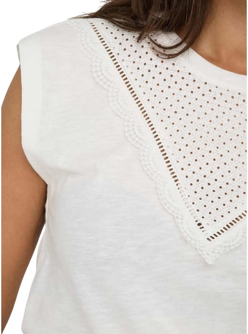 Camiseta Only. Modelo Delia. Cor branca. Gola redonda. Manga extra curta. Ajuste ligeiramente justo. Aplicação bordada estilo canesú no peito.