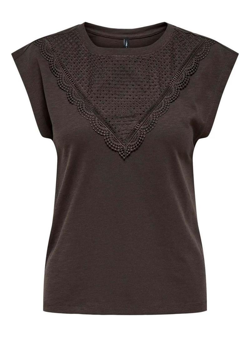 Camiseta Only. Modelo Delia. Cor marrom. Gola redonda. Manga extra curta. Ajuste ligeiramente justo. Aplicação bordada estilo canesú no peito.