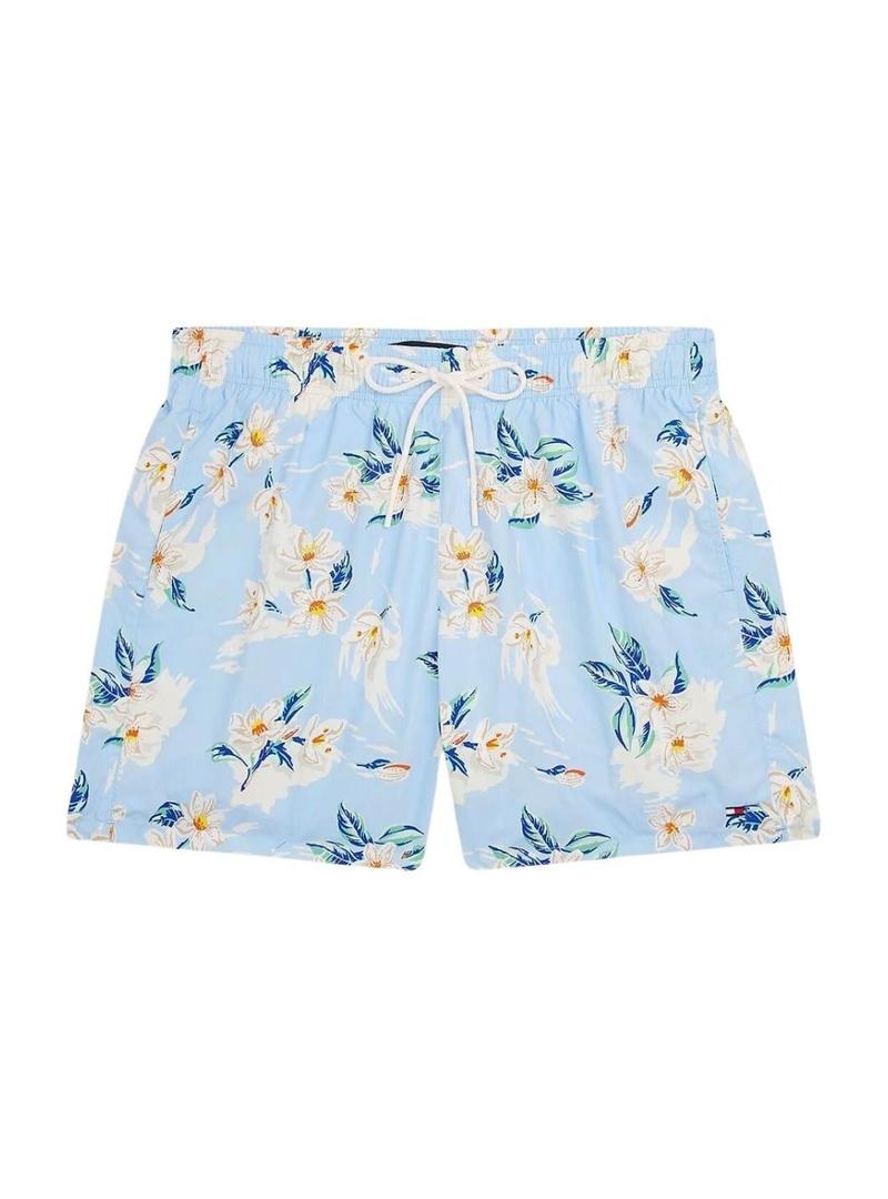 Fato de banho Tommy Hilfiger. Modelo Drawstring. Cor azul. Tecido de nylon. Estampa floral. Cintura elástica ajustável com cordão. Dois bolsos laterais. Bolso traseiro com ilhós. Detalhes distintivos da marca.