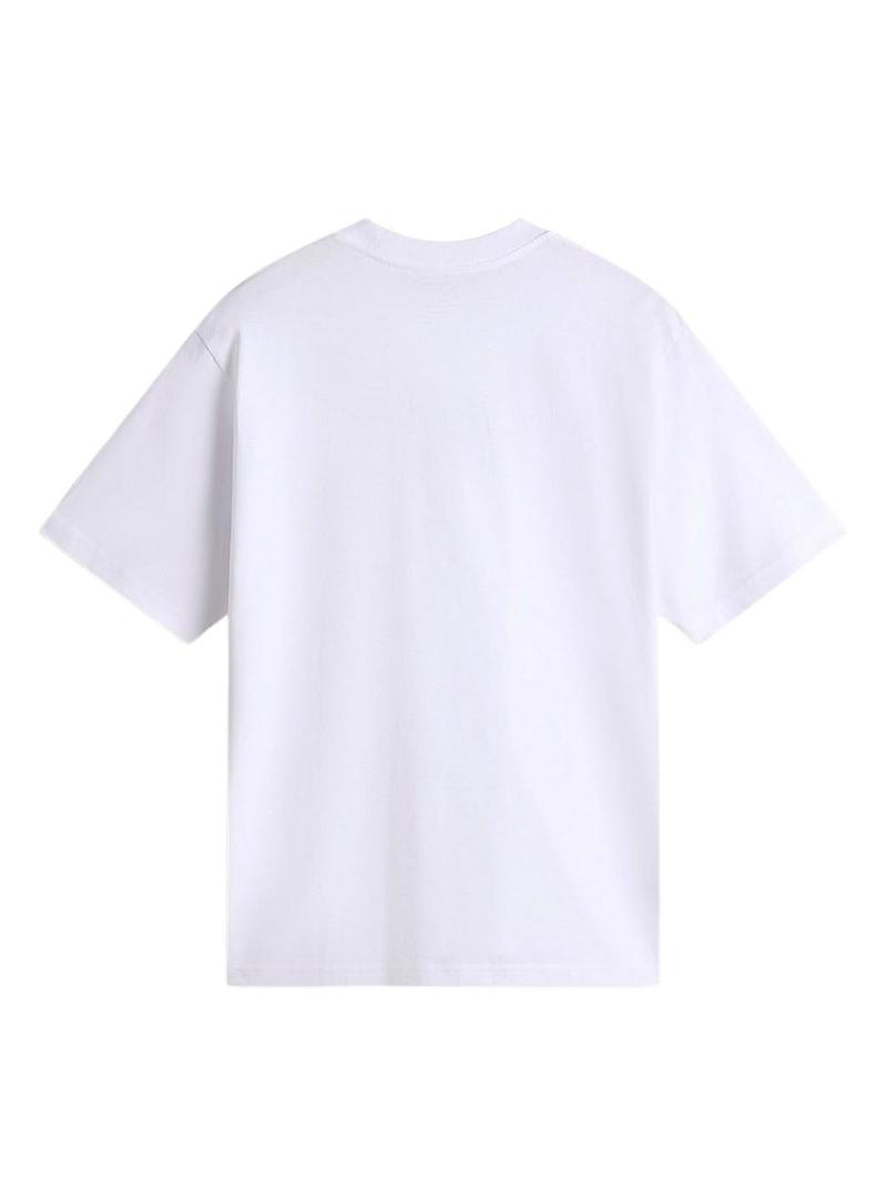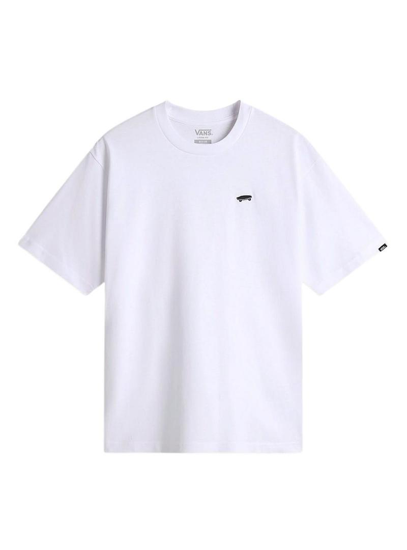 Camiseta Vans. Modelo Salon Loose. Cor branca. Gola redonda. Manga curta. Ajuste folgado. Skate bordado no peito. Etiqueta da marca na manga.