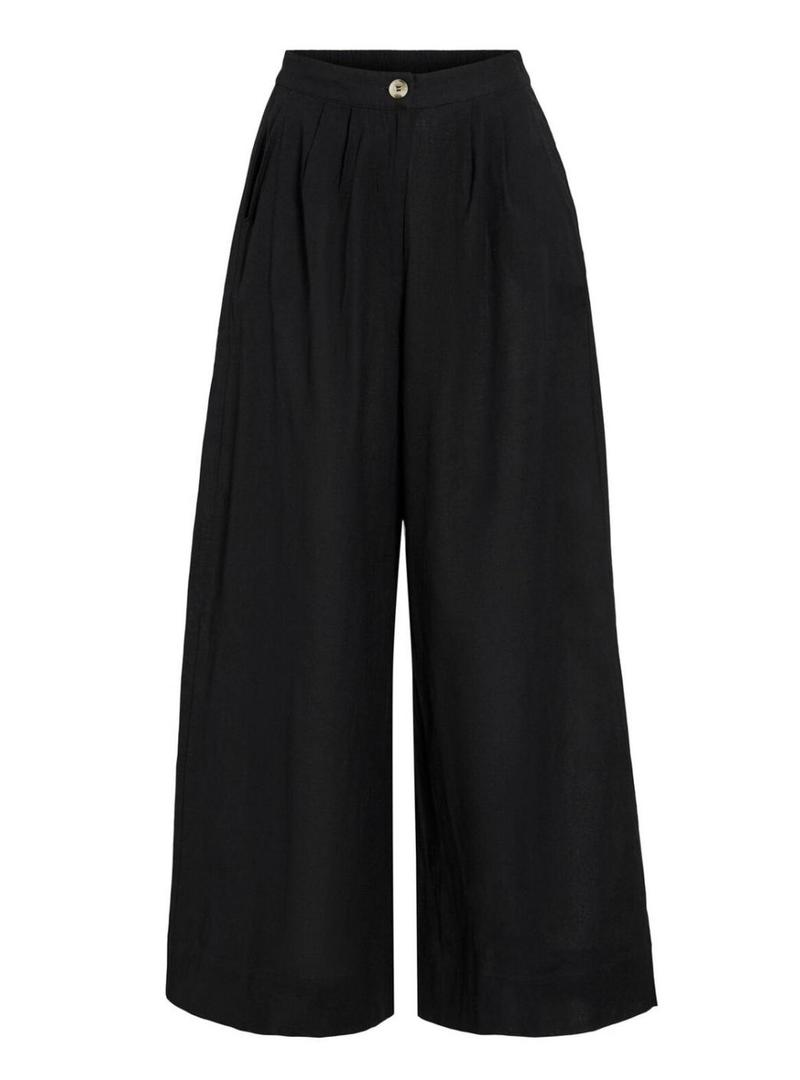 Calça Vila. Modelo Etni. Cor preta. Cintura alta. Bolsos laterais. Feitos de algodão e linho. Perna larga.