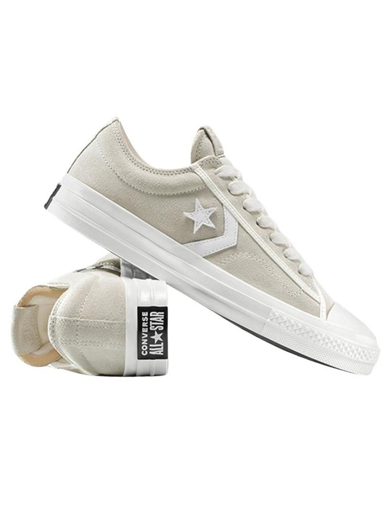 Sapatilhas Converse. Modelo Star Player 76 Suede. Cor bege. Parte superior em camurça resistente. Amortecimento OrthoLite. Zona do tornozelo acolchoada. Espuma exposta na língua. Ilhós perfurados. Cordões largos. Logotipo de estrela e galão de couro.