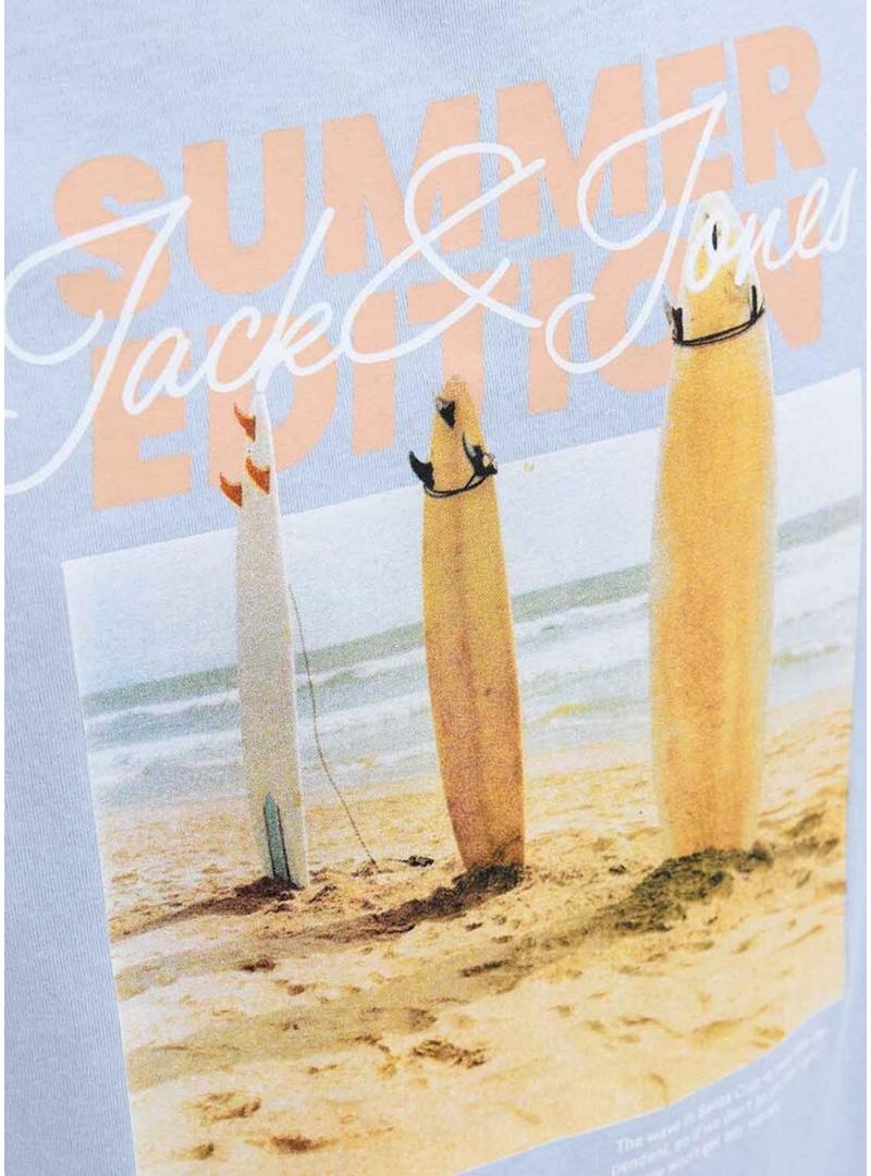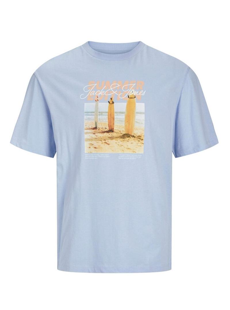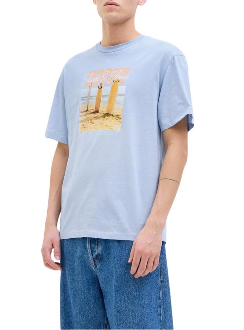 Camiseta Jack and Jones. Modelo Porto. Cor azul. Gola redonda. Manga curta. Ajuste regular. Imagem estampada no peito. Inspiração de férias.