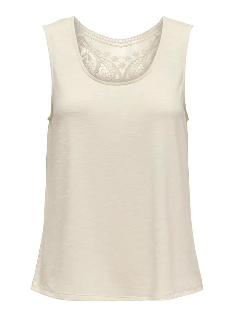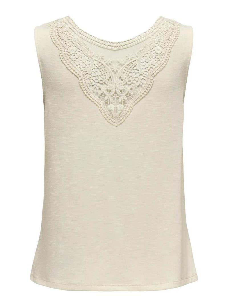 Camisa Only. Modelo Freda. Decote redondo. Sem mangas. Costas com decote em V e aplicação de renda. Ajuste regular. Cor bege.