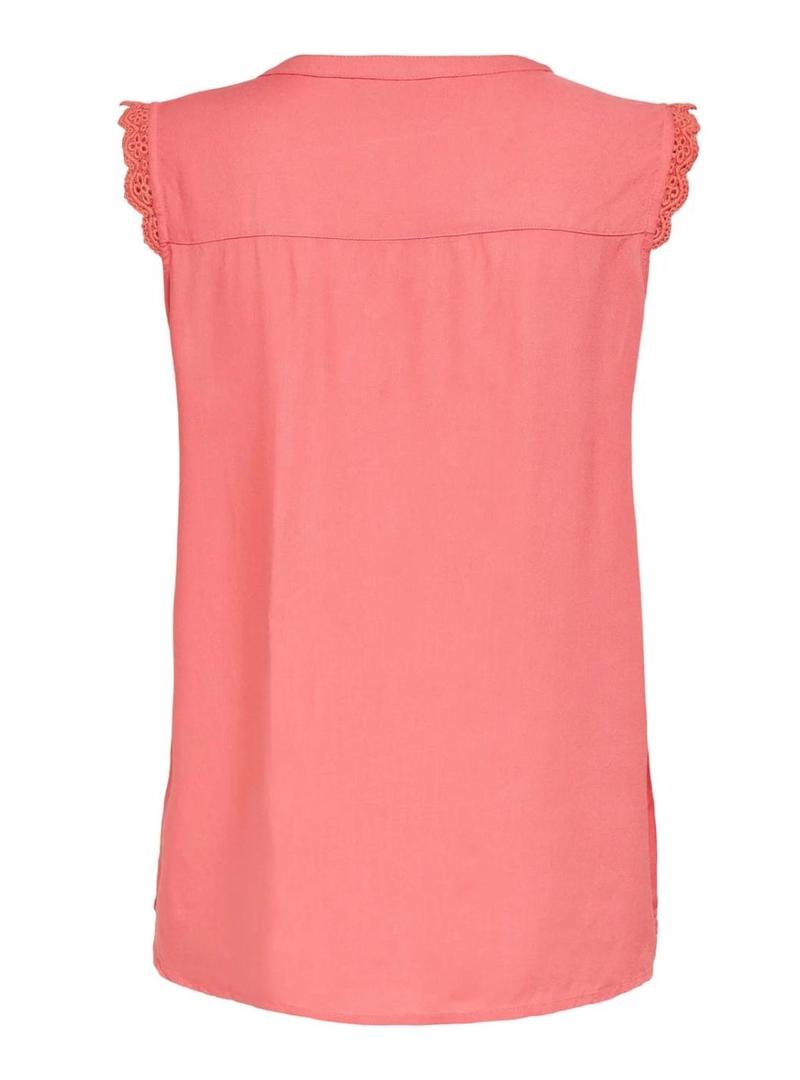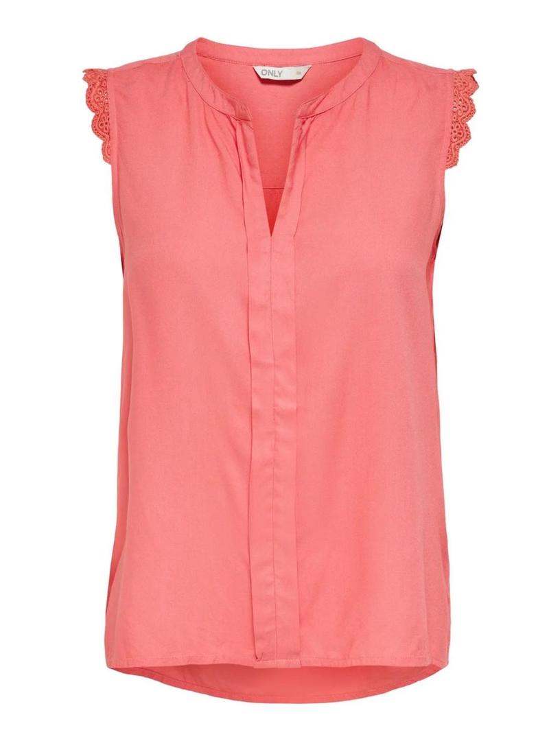 Top Only . Modelo Kimmi. Cor coral. Sem mangas. Decote em V. Tecido leve. Renda nas cavas.