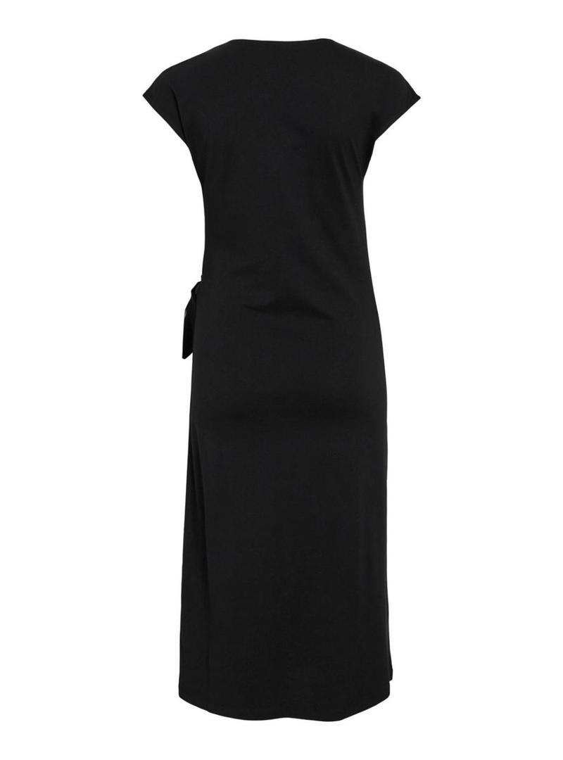 Vestido Vila. Modelo Vipompia. Cor preta. Manga curta. Costura lateral. Laço de autoamarração na cintura. Corte midi. Tecido suave e leve de algodão sustentável.