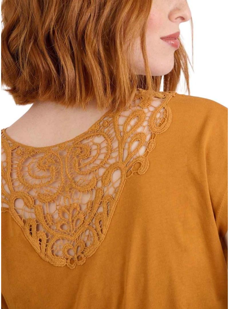 Camiseta Naf Naf. Modelo Renda. Cor laranja. Manga curta. Ajuste regular. Decote nas costas com detalhe bordado.
