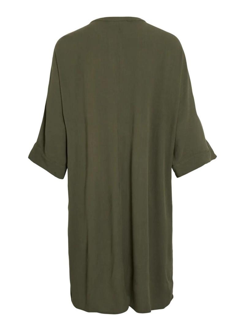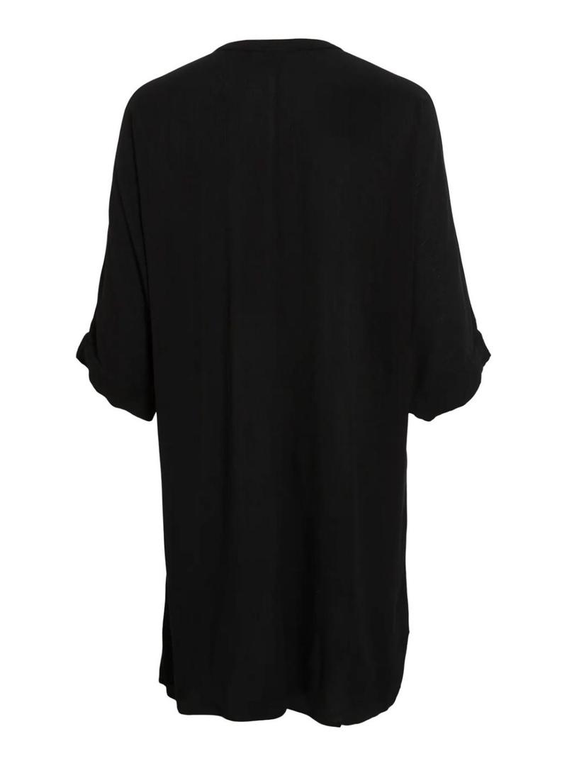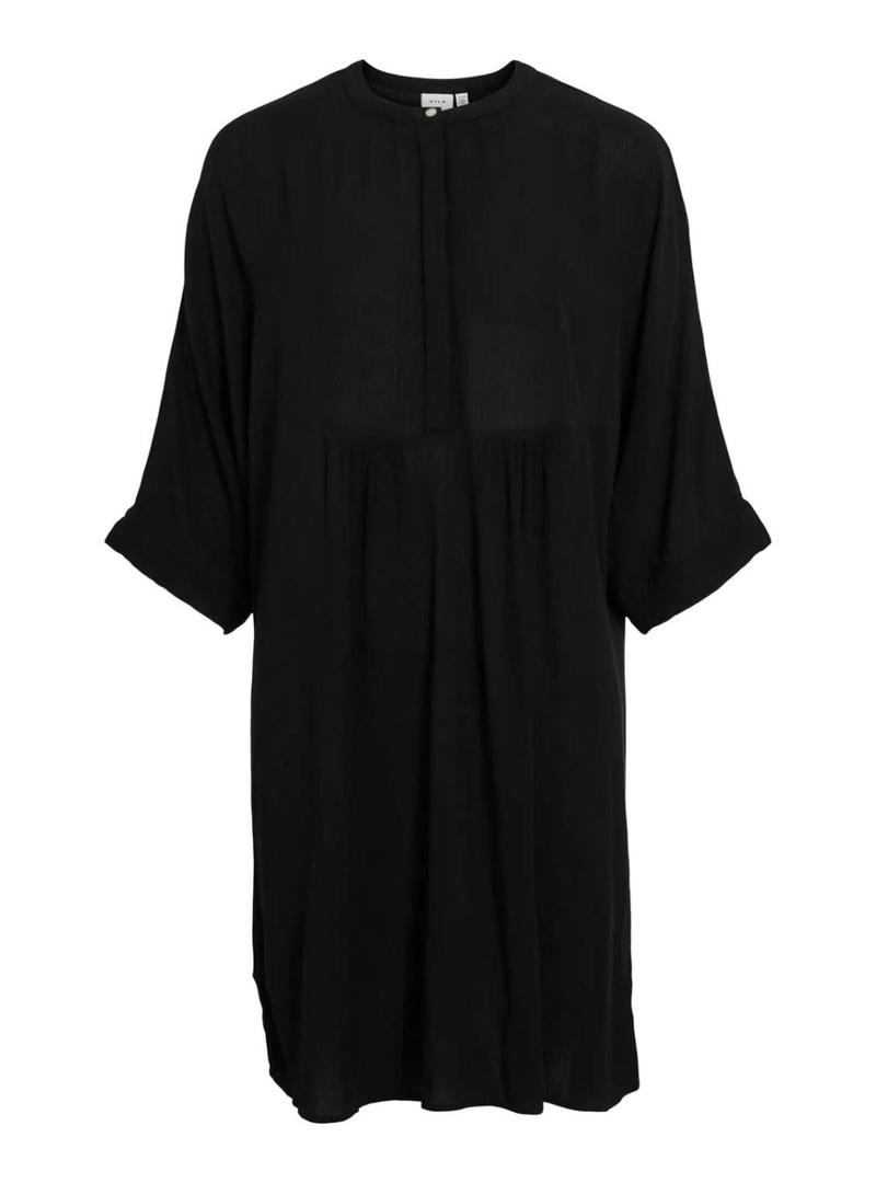 Vestido Vila. Modelo Vipaliva. Cor preta. Gola redonda. Manga 3/4. Botões de fecho ocultos no peito. Corte mini. Ajuste folgado. Tecido leve.