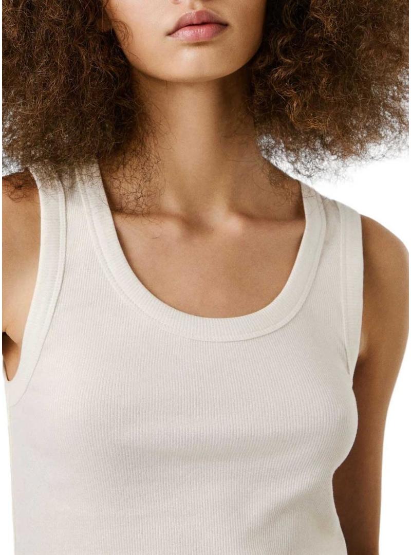 Camiseta Pepe Jeans. Modelo Bessy. Estilo regata. Sem mangas. Alça larga. Decote redondo. Tecido canelado. Corte justo. Logo Pepe Jeans bordado na barra. Acabamento dourado.