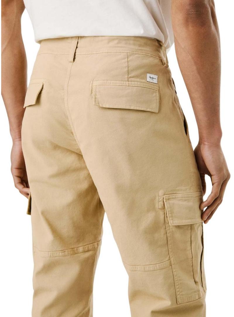 Calça cargo Pepe Jeans. Cor bege. Tecido de lona elástica. Lavagem em pedra e tingimento na peça. Corte regular. Bolsos italianos, laterais e traseiros com aba. Fecho com zíper e botão. Cintura interior com logo estampado. Etiqueta com logo no bolso traseiro. Fabricado 100% em algodão sustentável.