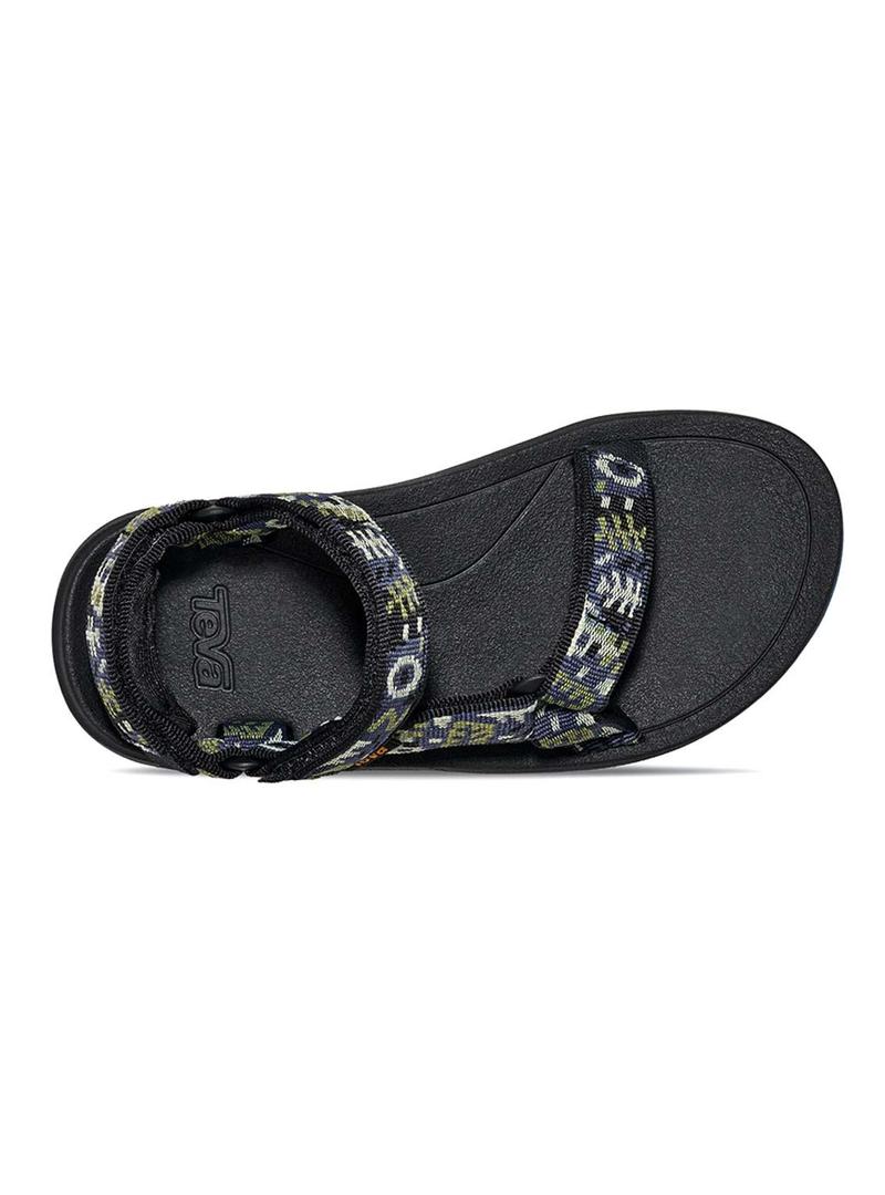 Sandálias Teva. Modelo Furacão. Cor preta. Estampa étnica em verde. Tiras de secagem rápida. Fecho de velcro. Palmilha de EVA. Sola de borracha com volume em marrom. Tratamento anti-odor com hortelã. Etiqueta lateral da marca. Sola em azul.