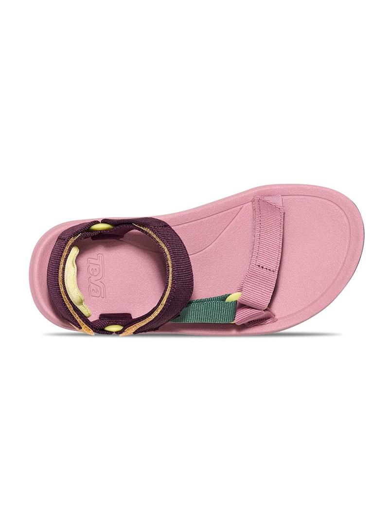 Sandálias Teva. Modelo Hurricane. Cor rosa, verde e roxo. Correias de secagem rápida. Fecho de velcro. Palmilha de EVA. Sola de borracha com relevo em marrom. Tratamento anti-odor com hortelã. Etiqueta lateral da marca.