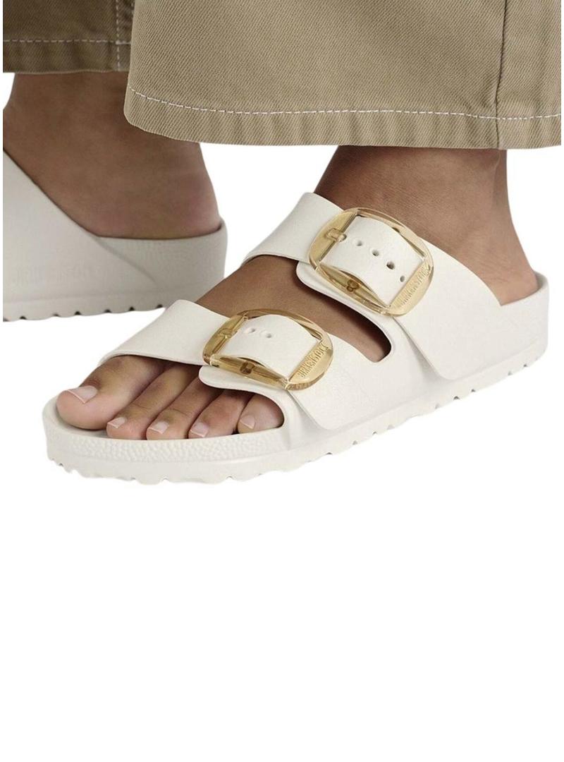 Sandálias Birkenstock. Modelo Arizona Big Buckle. Cor branca. Palmilha anatômica de EVA. Confeccionadas em EVA. Leves e flexíveis. Material de alta qualidade. Sem odor ou substâncias contaminantes. Impermeáveis e laváveis. Palmilha anatômica de EVA. Absorve impactos. Duas tiras com fivelas decorativas ajustáveis.