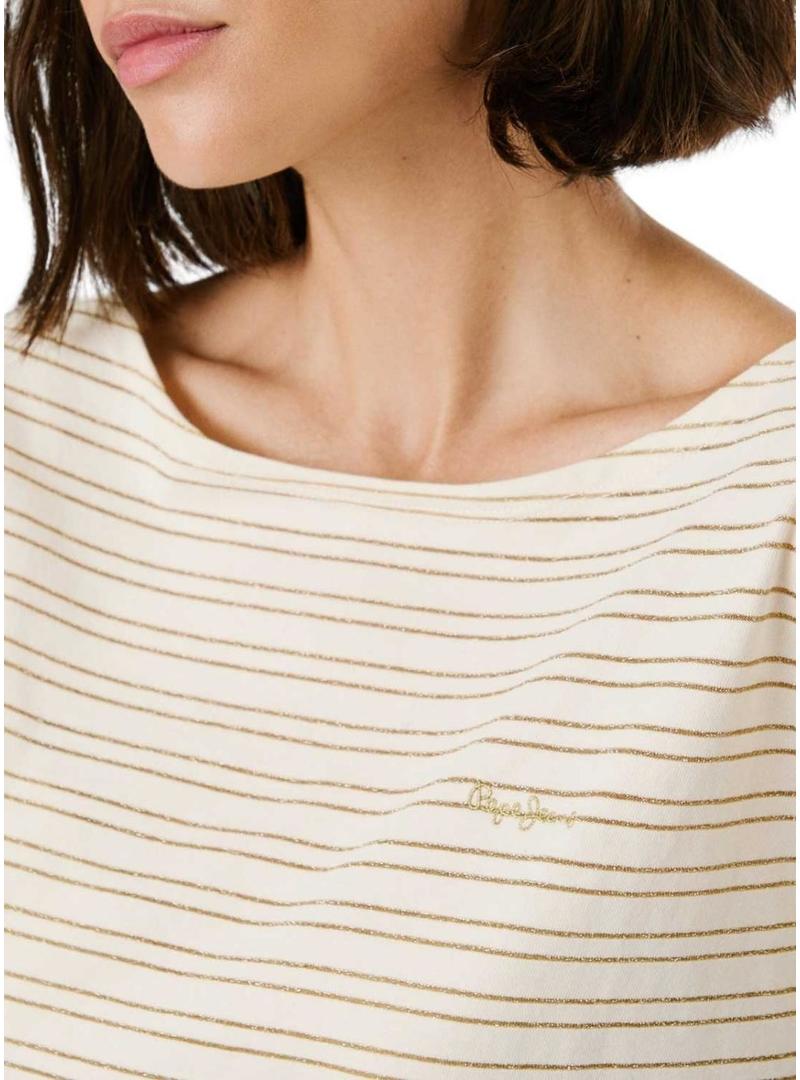 Camiseta Pepe Jeans. Modelo Elora. Cor bege. Listras horizontais em dourado. Gola redonda ampla. Manga extra curta. Ajuste regular. Decote nas costas com detalhe trançado.