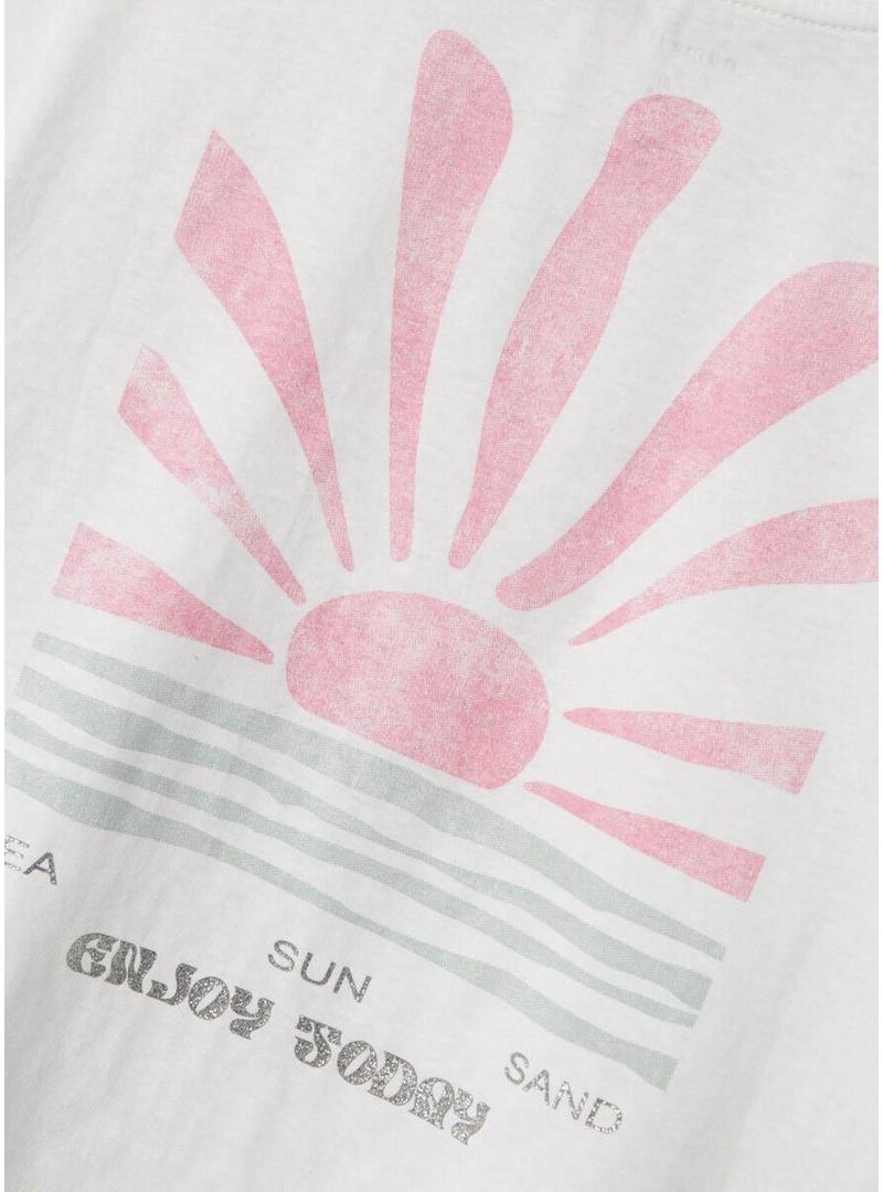 Camiseta Name It. Modelo Jely. Cor branca. Gola redonda. Manga curta. Ajuste quadrado. Ilustração estampada no peito e nas costas. Detalhes em rosa.