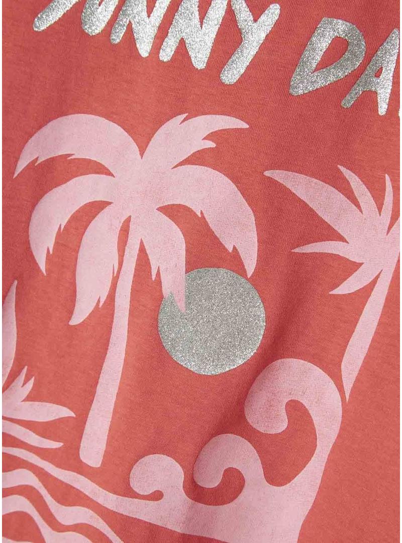 Camiseta Name It. Modelo Jely. Cor coral. Gola redonda. Manga curta. Ajuste quadrado. Ilustração tropical estampada no peito e nas costas. Detalhes em rosa e prateado.