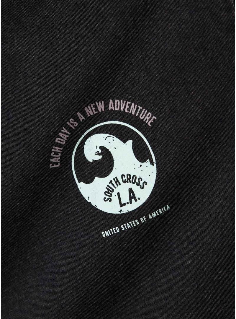 Camiseta Name It. Modelo Jeano. Cor preta. Gola redonda. Manga curta. Efeito lavado. Corte quadrado. Ilustração de surfista no peito e nas costas.