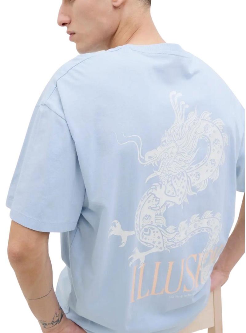 Camiseta Jack and Jones. Modelo Charge. Cor azul claro. Gola redonda. Manga curta. Ilustração de Dragão estampada nas costas com detalhes em branco. Mensagem estampada no peito. Ajuste folgado.