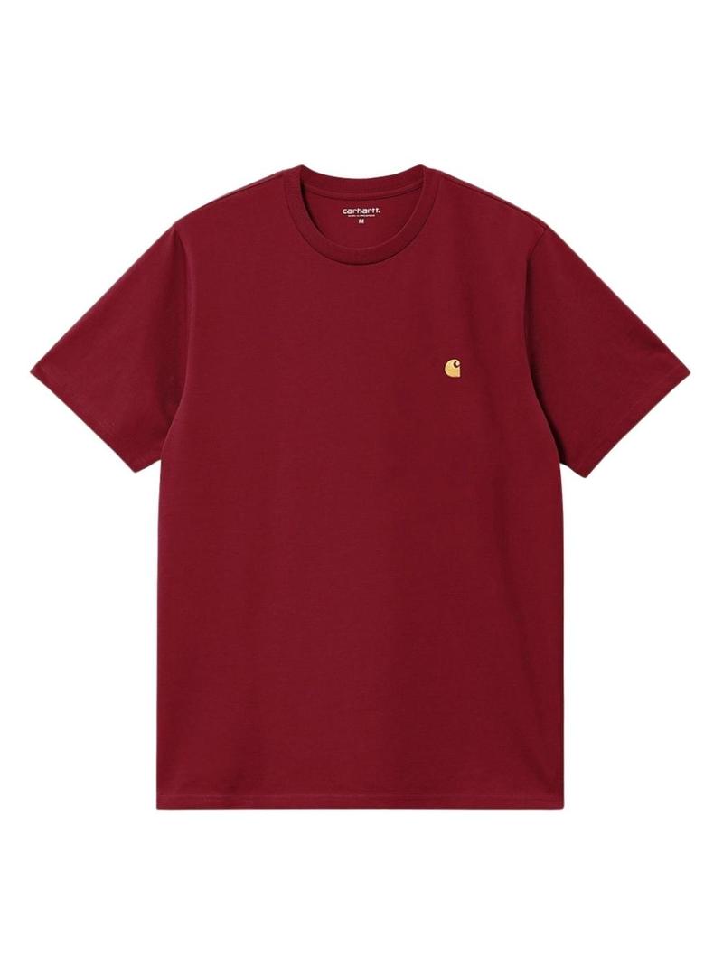 Camiseta Carhartt. Modelo Chase. Cor vinho. Gola redonda. Manga curta. Logotipo bordado no peito em fio dourado. Caimento folgado.