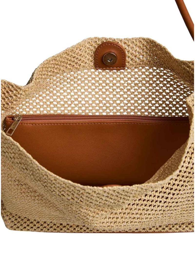Bolsa Pieces. Modelo Fikka. Tecido de ráfia. Fecho com botão de pressão. Nécessaire de couro sintético no interior. Fecho com zíper. Alça de ombro.