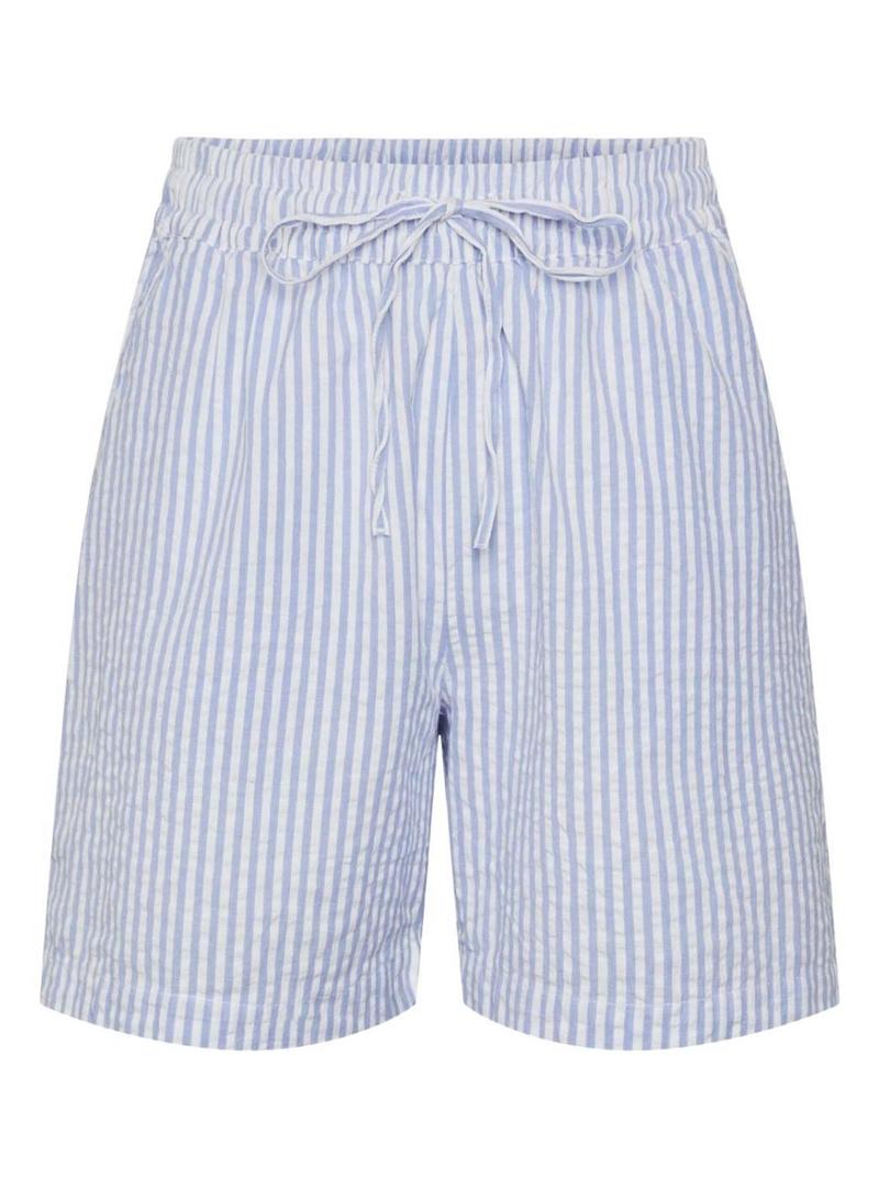 Bermudas Pieces. Modelo Sally. Cor azul. Tecido com estampa de listras verticais. Bolsos laterais. Cintura elástica com cordão ajustável. Estilo pijama.