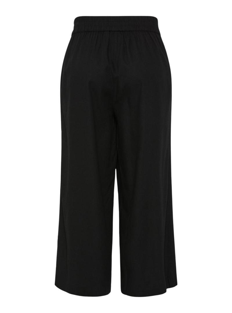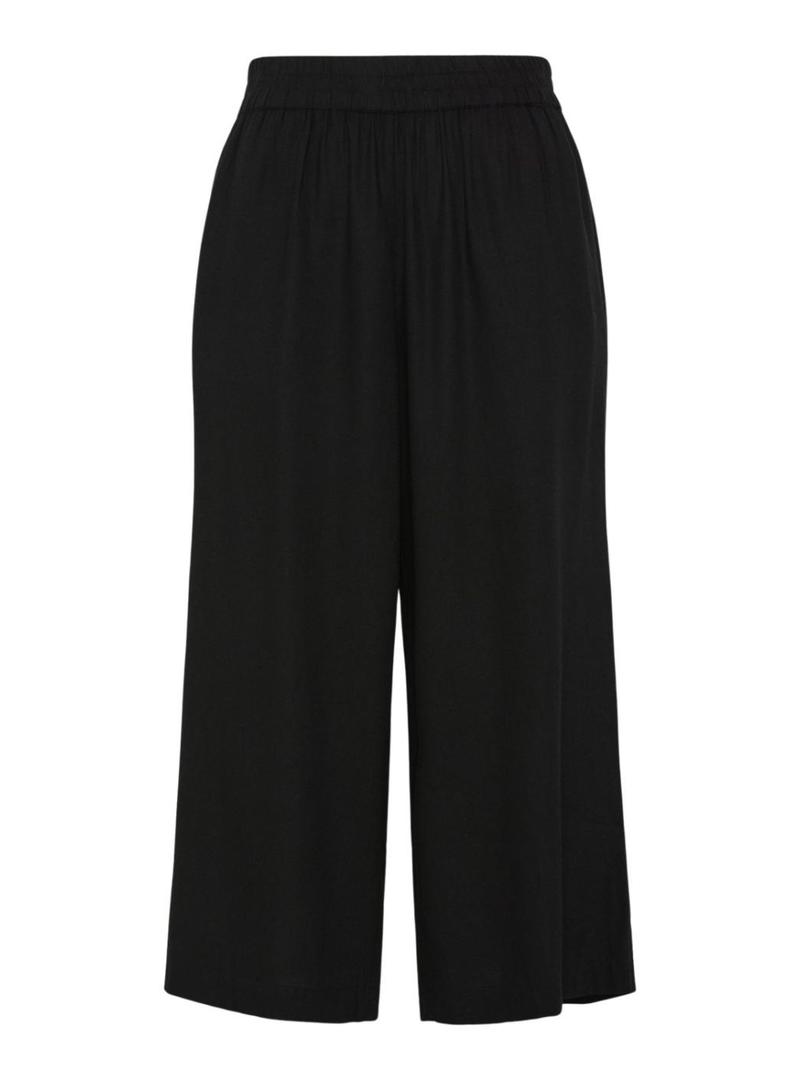 Calça Pieces. Modelo Pia. Cor preta. Corte culotte. Cintura elástica. Comprimento acima dos tornozelos. Bolsos laterais. Tecido leve com linho.