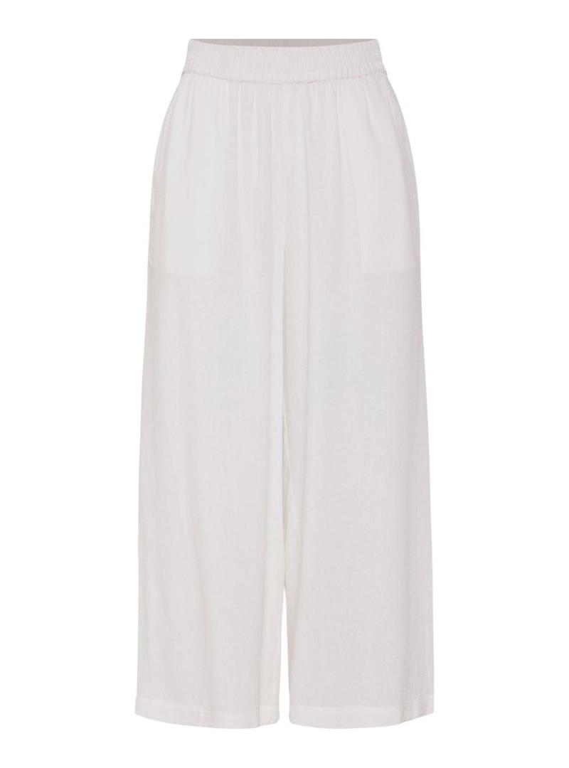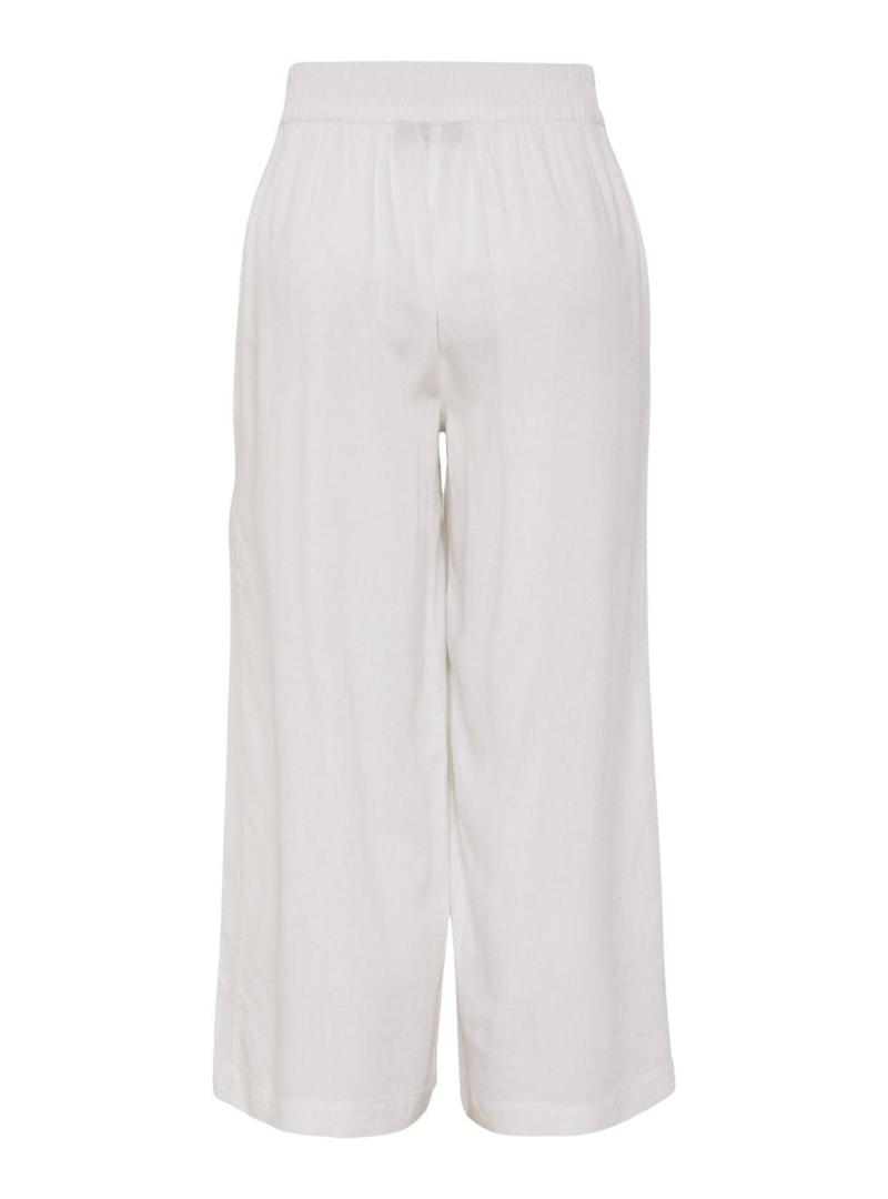 Calças Pieces. Modelo Pia. Cor branca. Corte culotte. Cintura elástica. Comprimento acima dos tornozelos. Bolsos laterais. Tecido leve com linho.